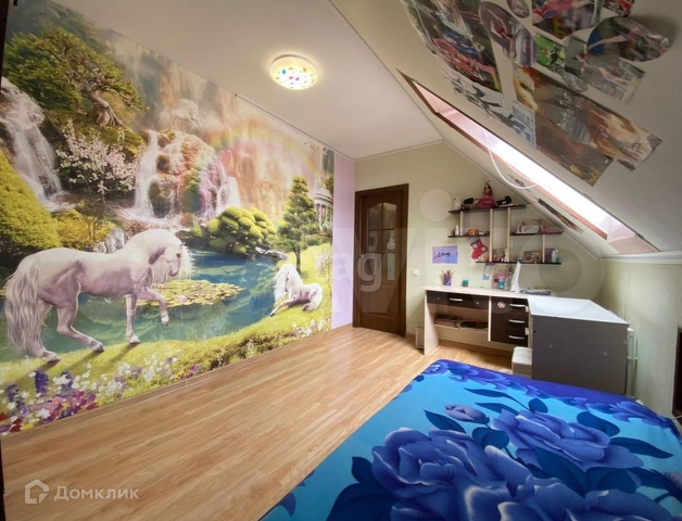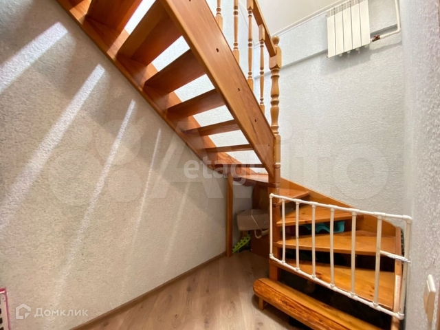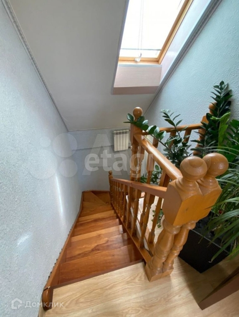 на 2 этаж ведёт лестница, выполненная из дерева хвойных пород, обработанная септиком и покрытая лаком, на этаже две спальни с большими мансардными окнами.