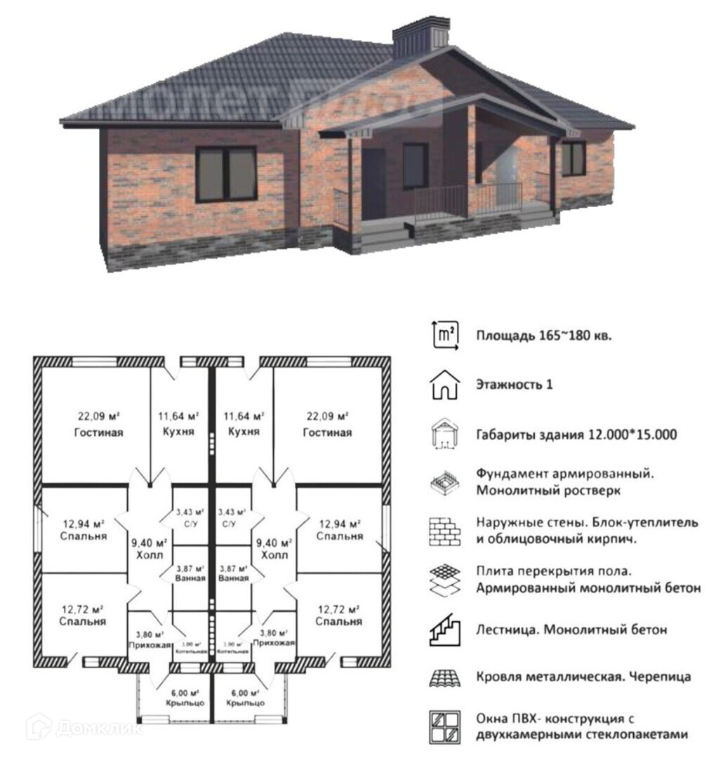 2 спальные комнаты (12,72 и 12,94 м2), гостиная 22,09 м2, кухня 11,64 м2, с/у 3.43 м2, ванная комната 3,67 м2, холл 9,40 м2, прихожая 3,80 м2 , котельная 3 м2, крыльцо 6 м2.