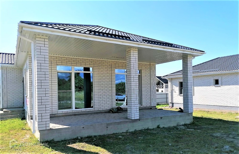 Фундамент ленточный. Дом облицован белым стильным кирпичом и смотрится достойно.