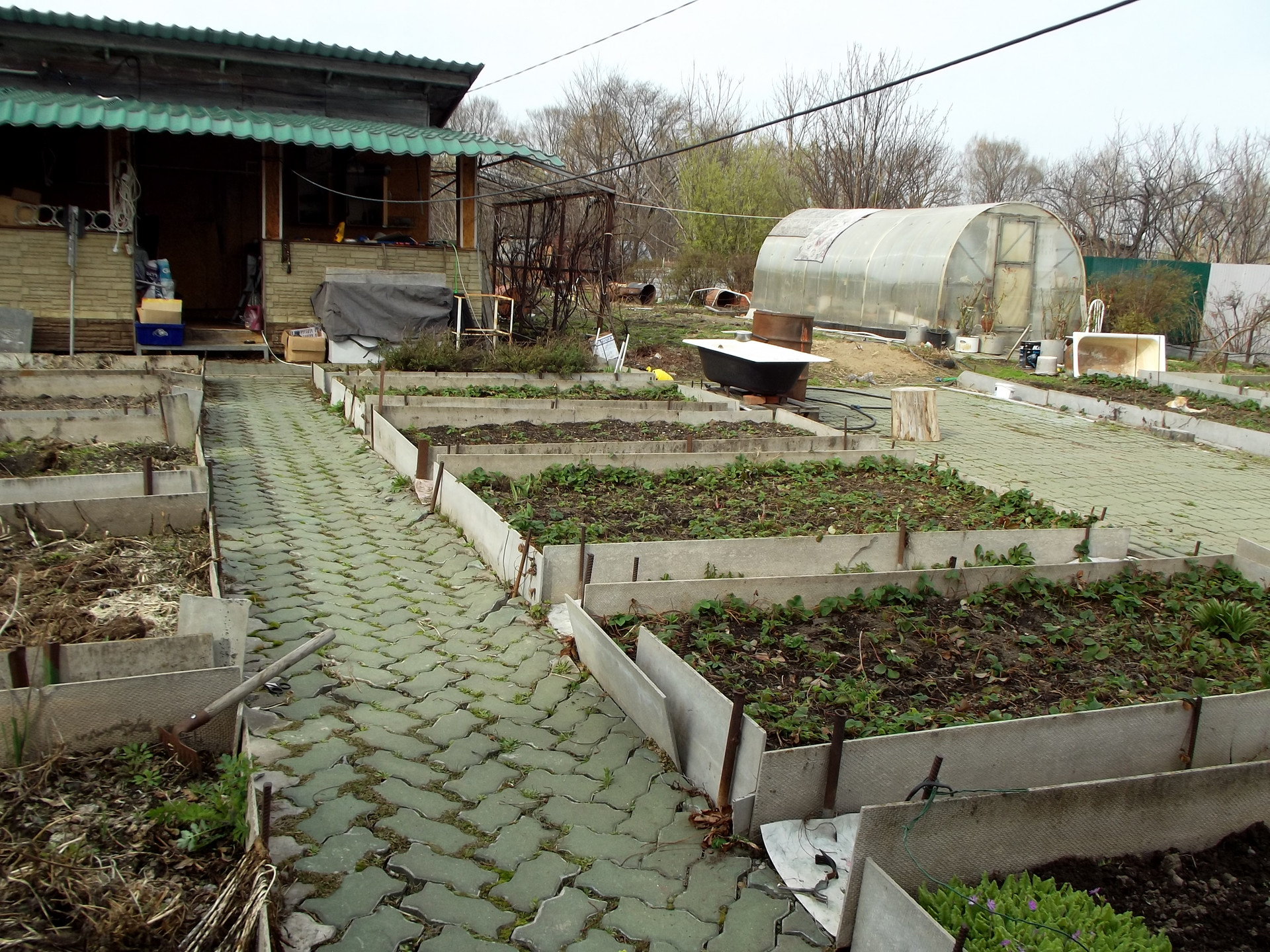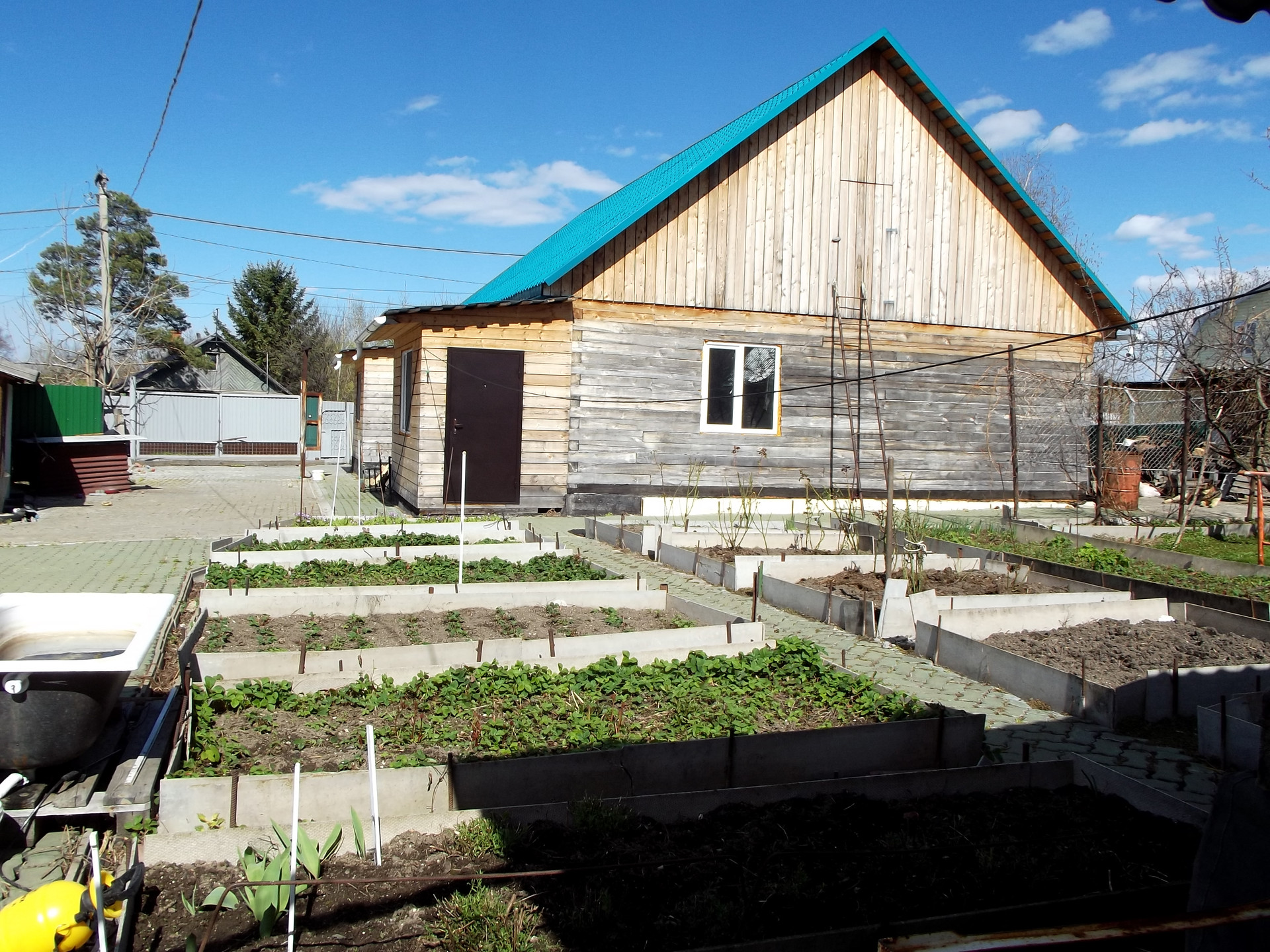 Теплица из поликарбоната 24 кв.м, большой парник, цветник, много грядок, огороженных шифером.