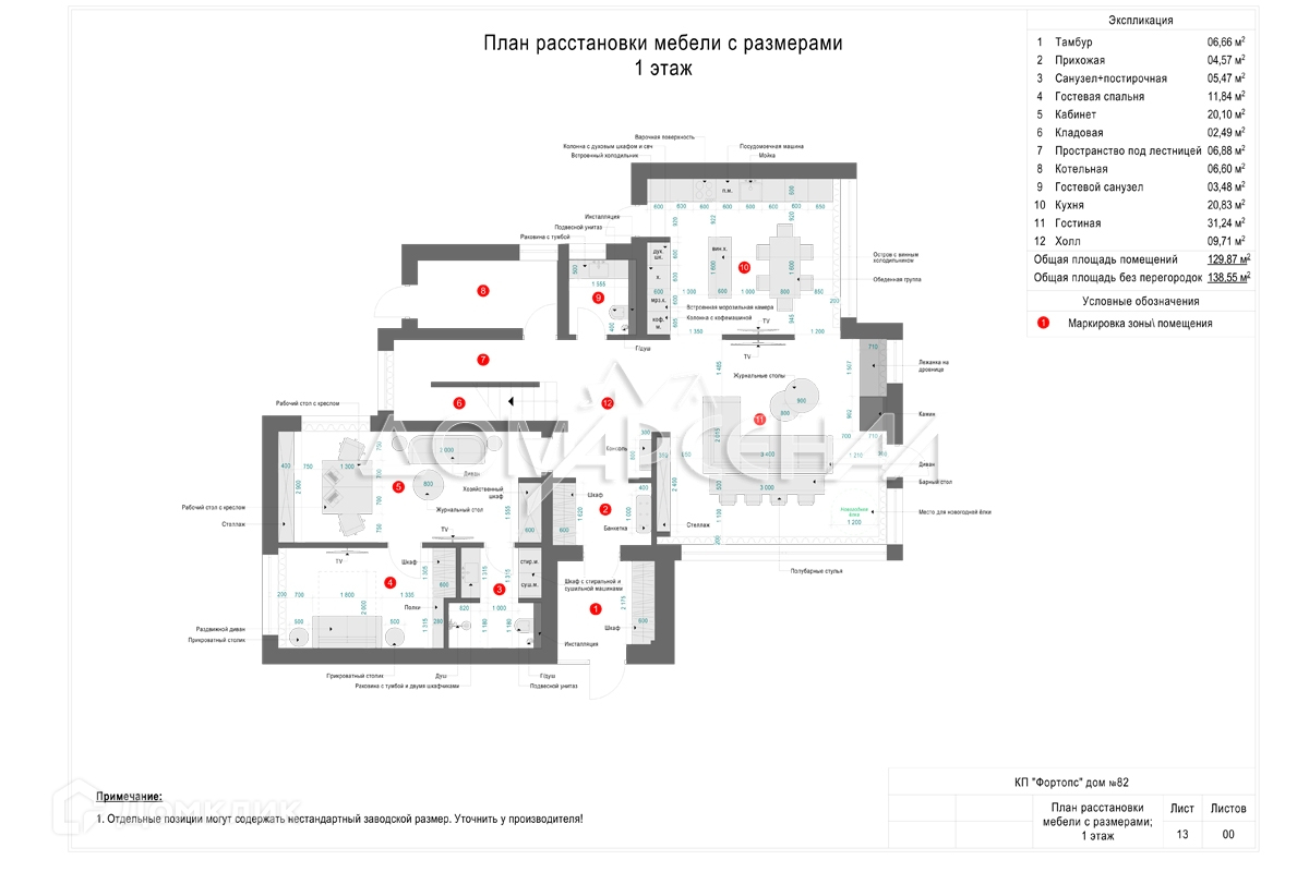 Проектом предусмотрено: 1 этаж: холл, гостиная, кухня-столовая с выходом на веранду, гостевая спальня, кабинет, с/у, постирочная, кладовая, котельная, с/у.