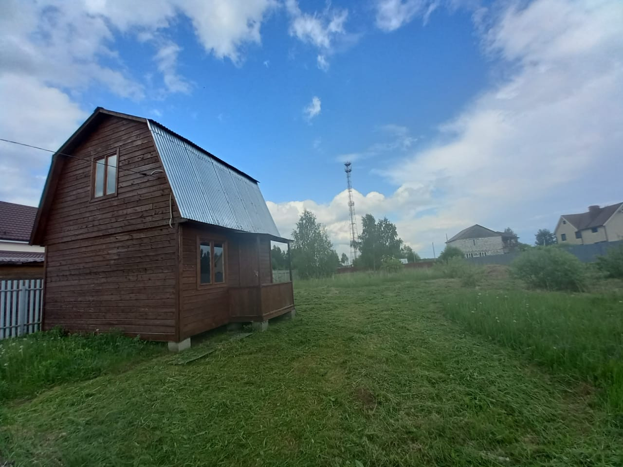 Двухэтажный каркасно-щитовой дом общей площадью 31 кв.м. (утеплен), стоит на блоках, деревянные окна, крыша покрыта профлистом. Второй этаж мансардный.  Разведено электричество, газ проходит по границам участка (можно подключить). Дом новый, строился в 2015 году. Постройка зарегистрирована.