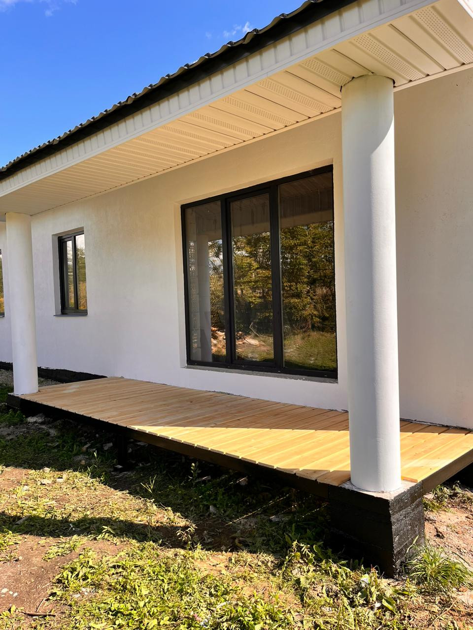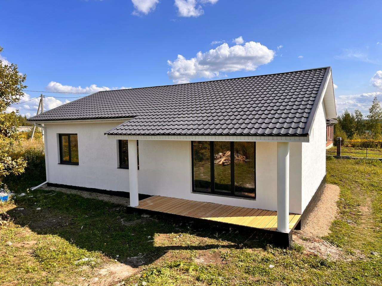 Дом построен на свайно-ростверковом фундаменте, материал стен газоблок «Калужский», крыша двухскатная металлочерепица «Гранд Лайн»!