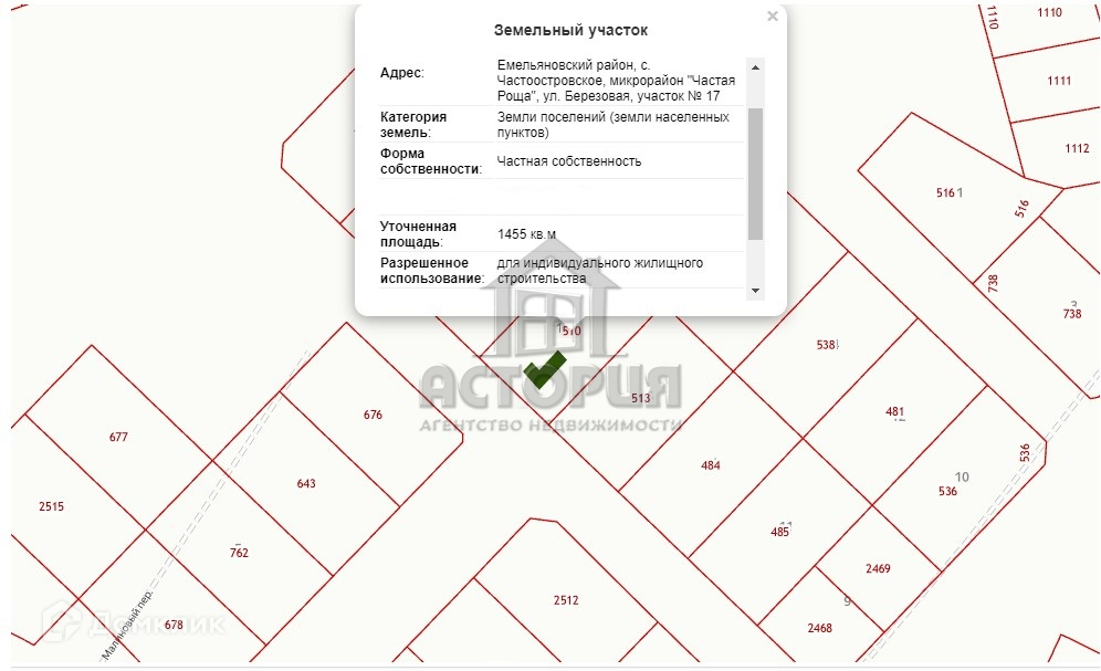 Просторный участок прямоугольной формы площадью 15 соток в селе Частоостровское микрорайон «Частая роща», ул. Березовая, участок №17.