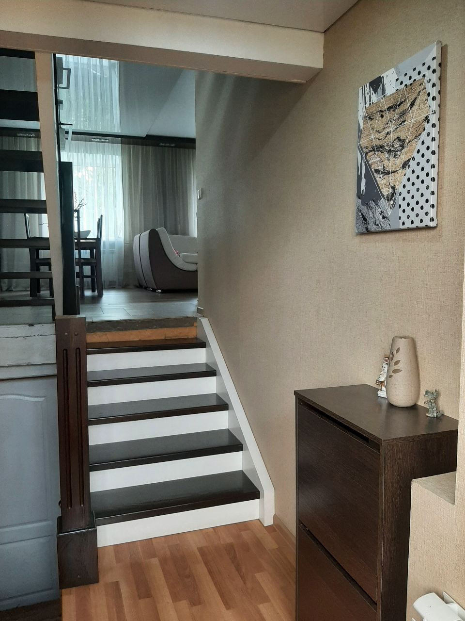 На 1 этаже находятся - прихожая, встроенный большой шкаф, кухня, совместный санузел, гостиная с болконом.