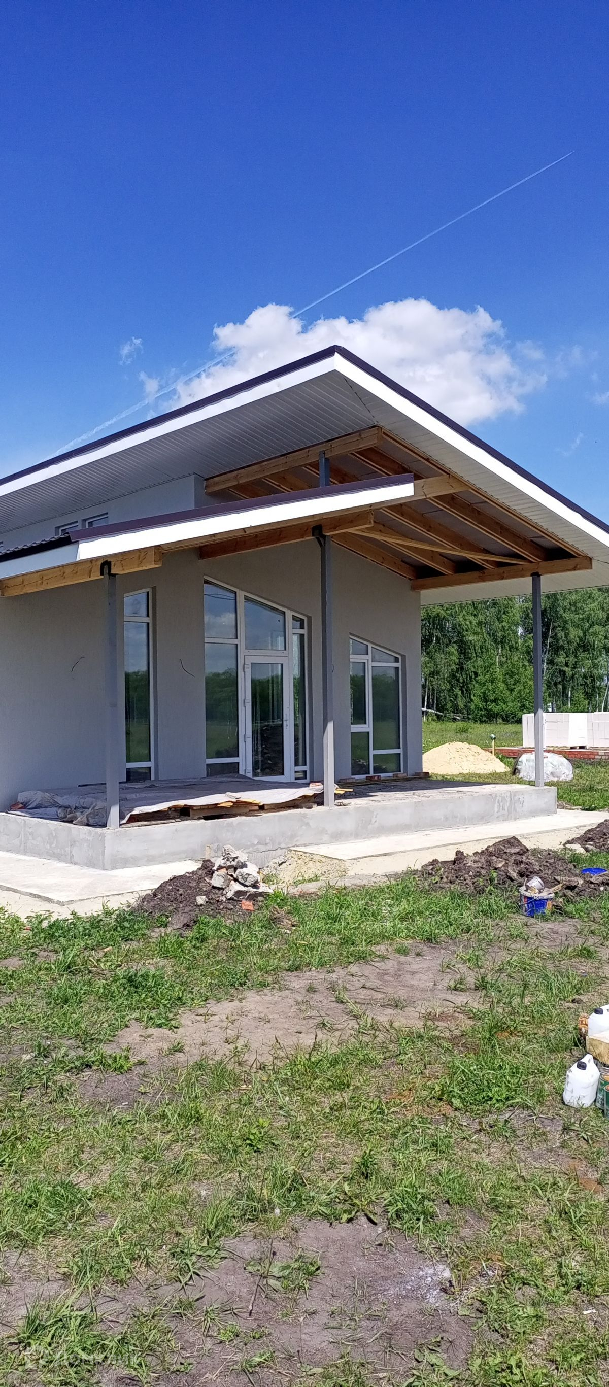 Фундамент и материал перекрытий - сборный железобетон, материалом стен является пеноблок с последующим фасадным утеплением, кровля скатная совмещенная, утепленная. Все дома имеют остекления ПВХ и возможность выйти на террасу. Размещение домов внутри земельного участка позволяет, как просматривать всю территорию участка, так и располагать дополнительные постройки по желанию.