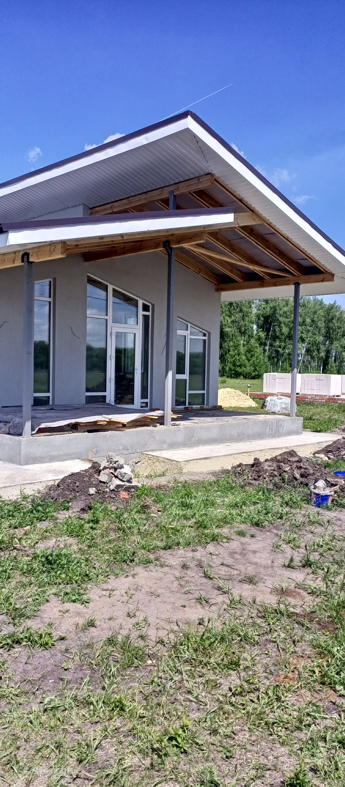 Фундамент и материал перекрытий - сборный железобетон, материалом стен является пеноблок с последующим фасадным утеплением, кровля скатная совмещенная, утепленная. Все дома имеют остекления ПВХ и возможность выйти на террасу.