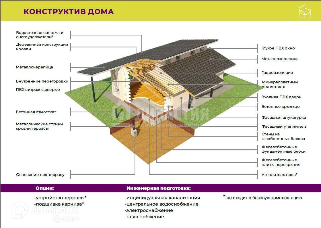 Фундамент и материал перекрытий - сборный железобетон; материал стен - автоклавный газобетонныйблок с последующим фасадным утеплением; кровля скатная совмещенная, утепленная; остекление ПВХ.