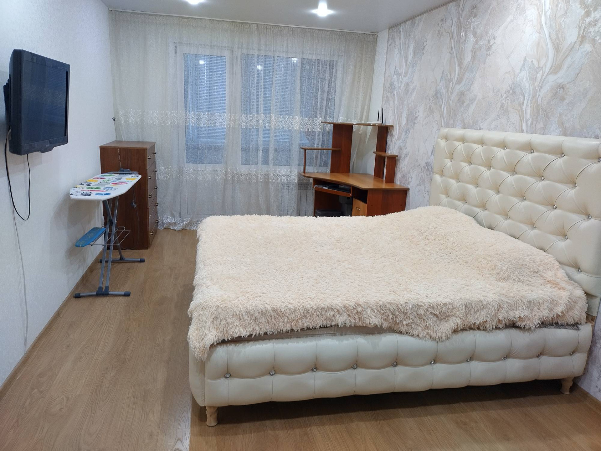 Пластиковые окна, на полу ламинат, на лоджии стеклопакет. Всё в хорошем состоянии, ремонт делали для себя.