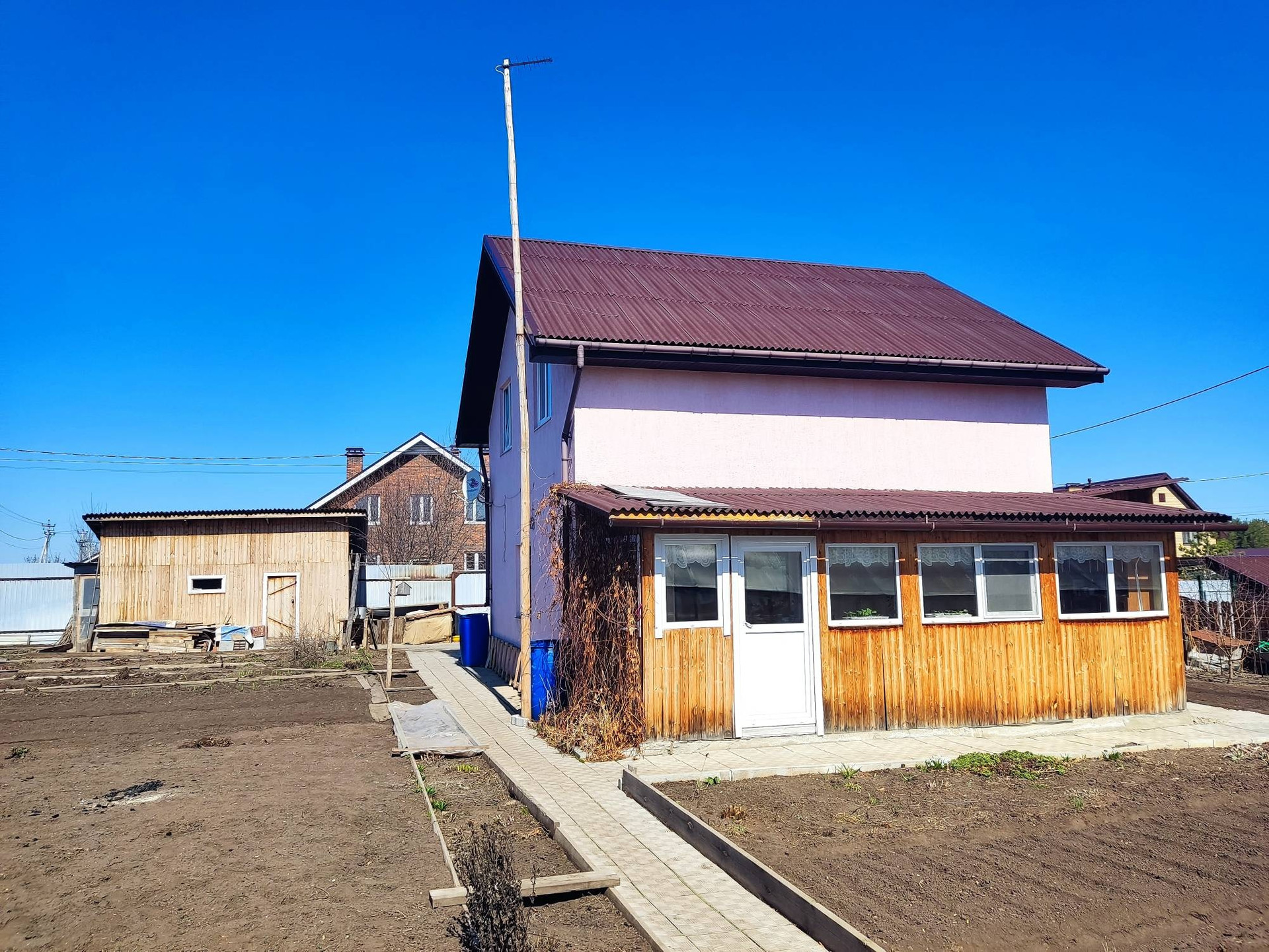 Отапливаемый гараж, баня, дровеник, отличная теплица 14м, 380В, утеплёная веранда, скважина 35м, ГВС, выгребная яма. Участок 10 соток. Проведён ГАЗ.