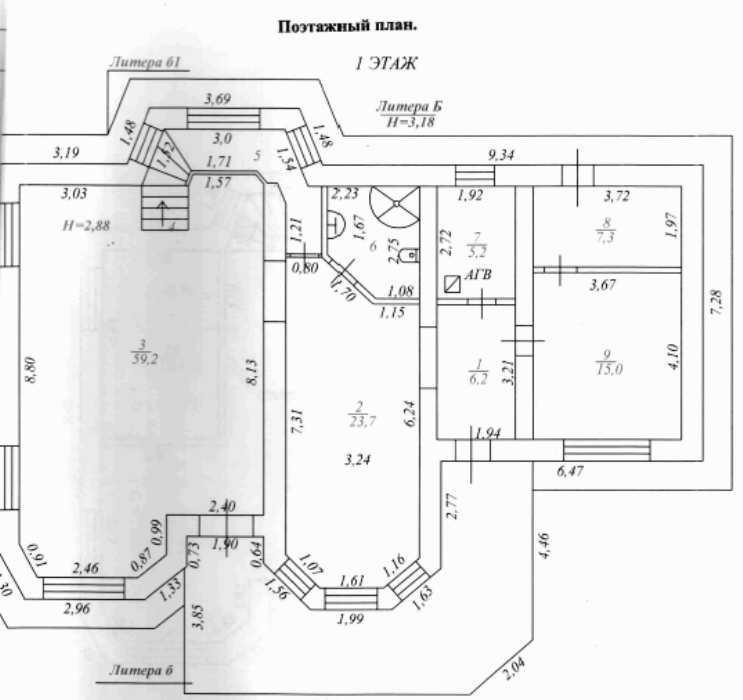 1 этаж: Кухня 24 кв.м, гостиная - 59 кв.м, кабинет - 15 кв.м, гардеробная - 7 кв.м, котельная санузел с душевой кабиной.