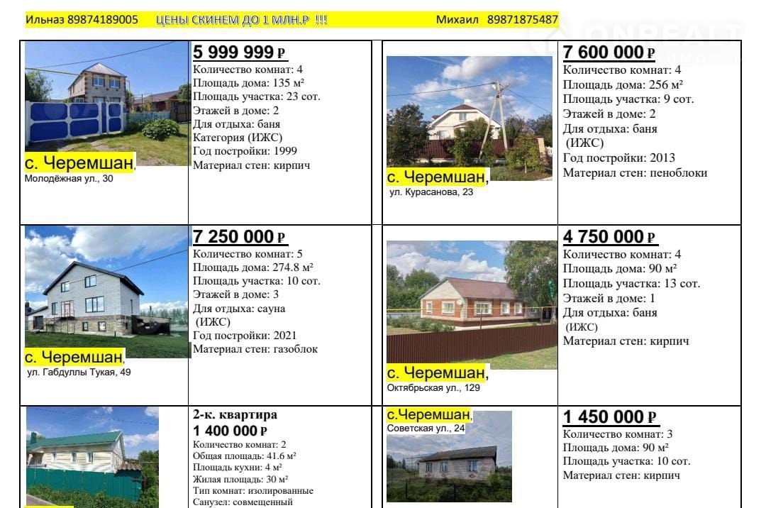 Для желающих купить дом или квартиру в районном центре Черемшан мы поможем выбрать подходящий для вас недвижимость, оформить документы, одобрить ипотеку по выгодной ставке, выторговать у продавцов до 1.5 млн.р . А так же поможем найти работу по вашей профессии, устроим детей в детский сад, школу. Поможем переехать, решить проблемы с пропиской, устранить ограничение в приставах и многое другое. Если у вас есть недвижимость в Татарстане, России, есть возможность через нас обменять, продавать, подготовить документы, провести юрпроверку. Вам только остается звонить по телефону, рассказать ваши пожелание, проблемы, организуем встречу онлайн, офлайн. Консультация бесплатно! Объекты можно смотреть удаленно и в живую!