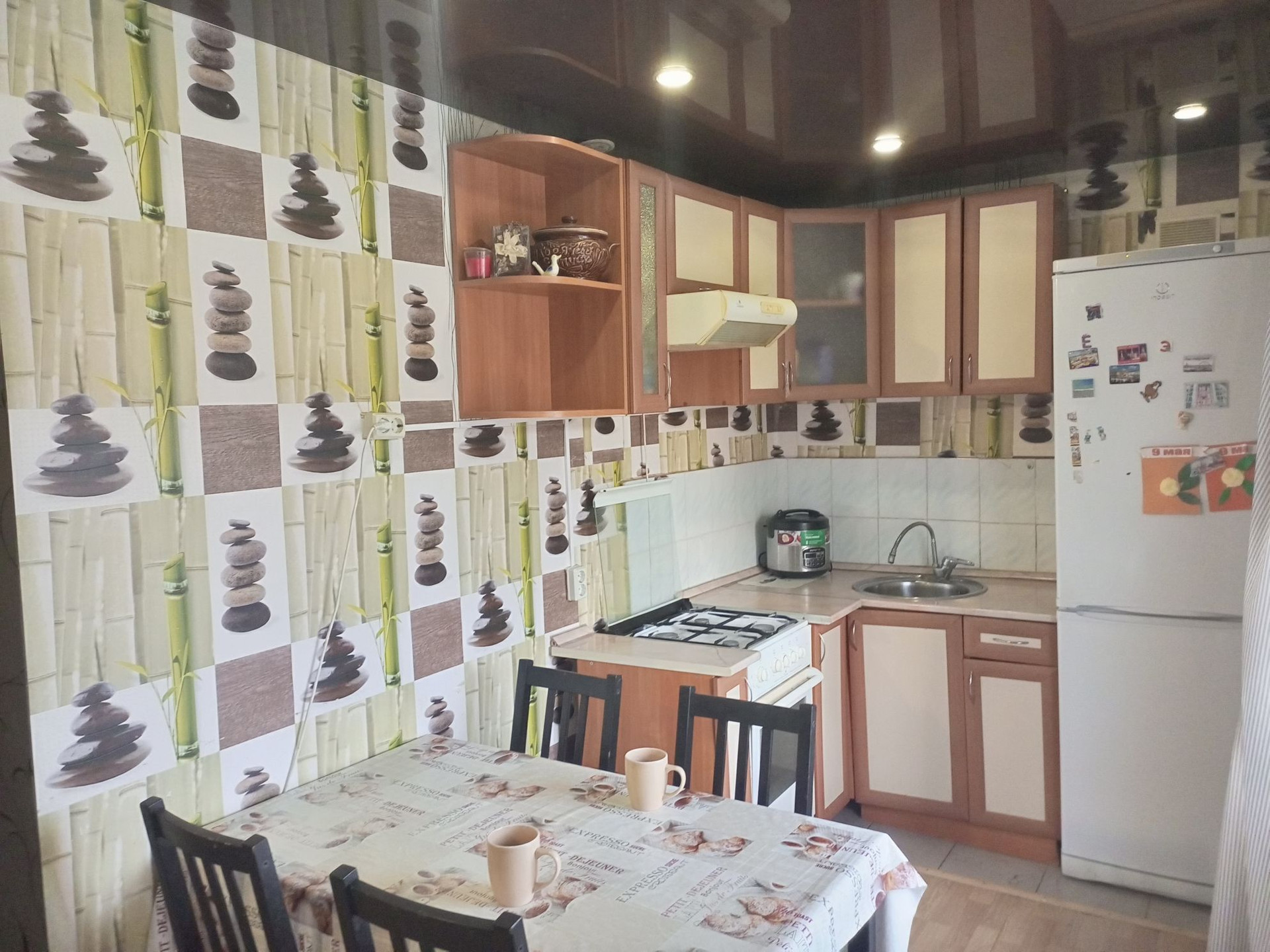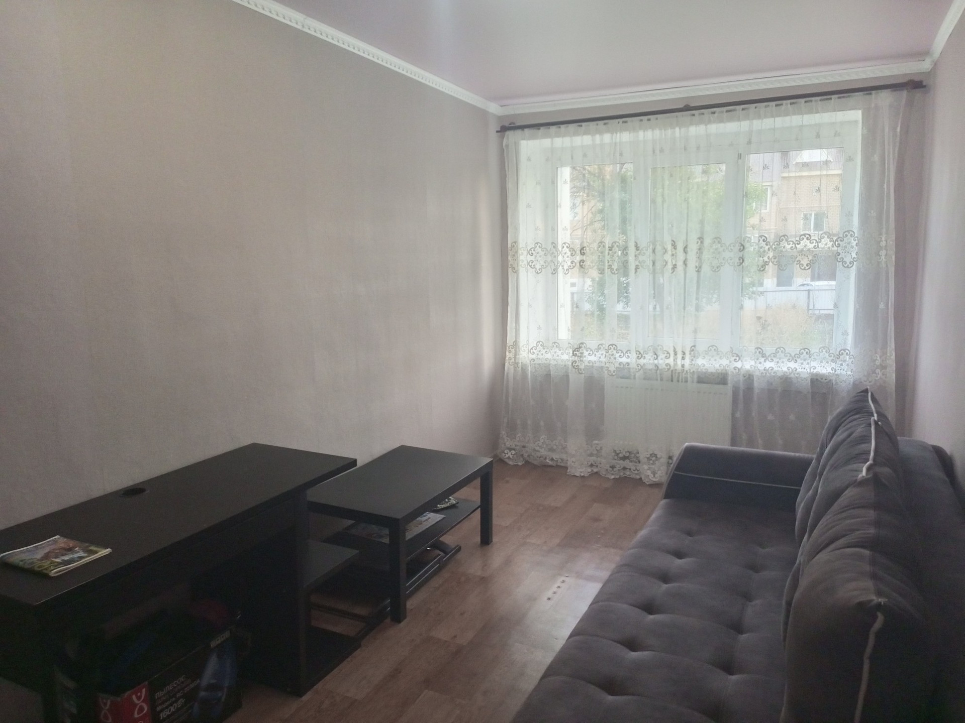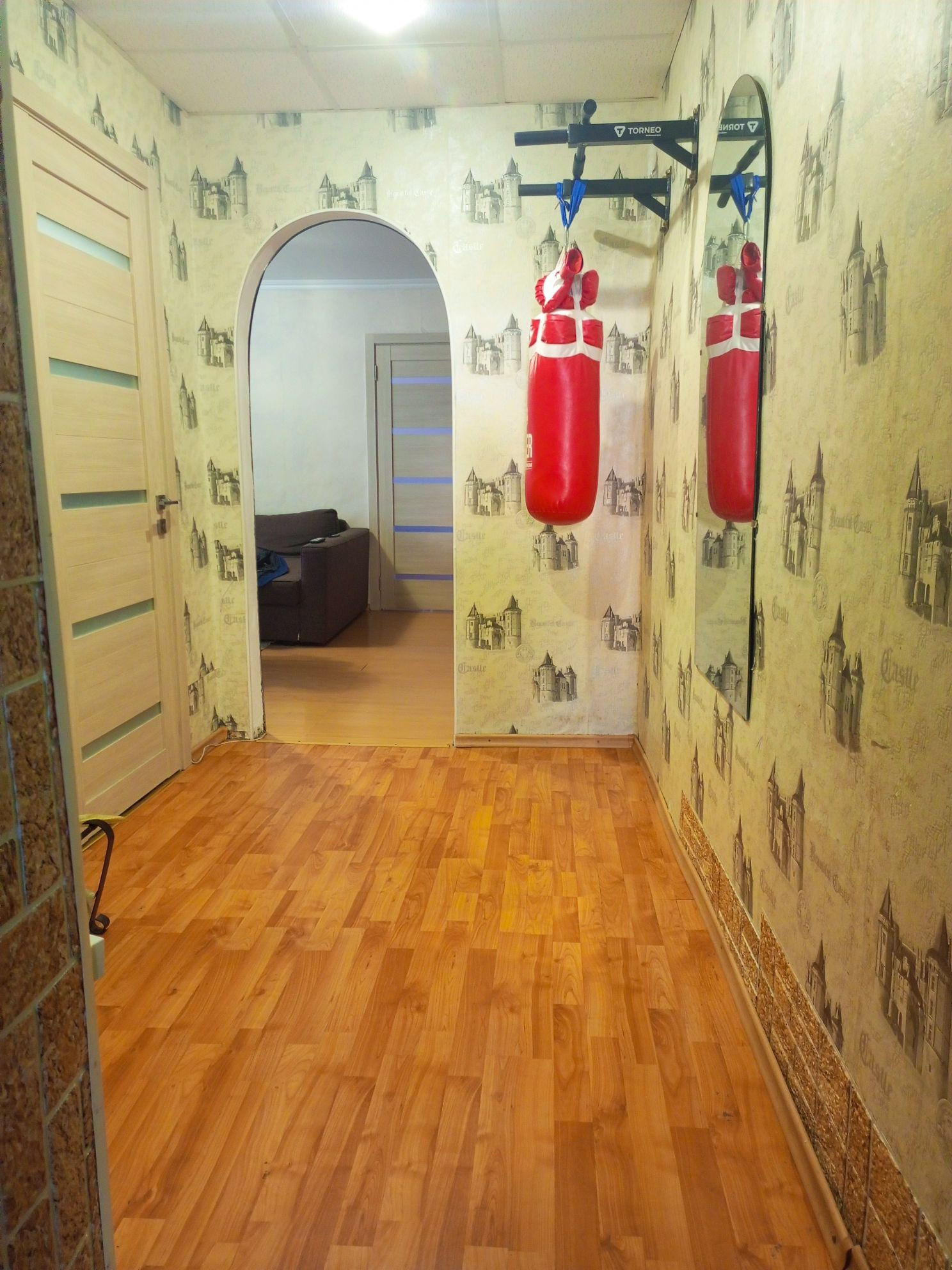 Красивые натяжные потолки, на полу ламинат, ванная комната вся в плитках, красивые современные обои. Остается мебель и техника, некоторое конечно.