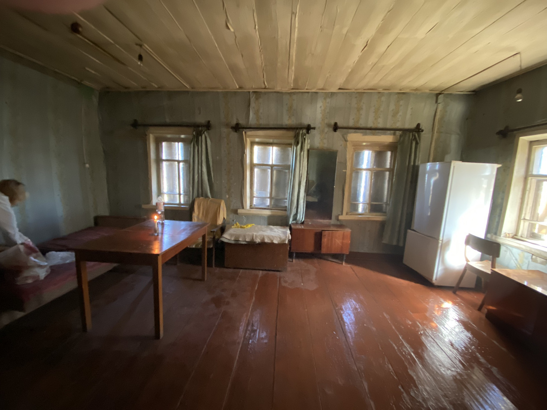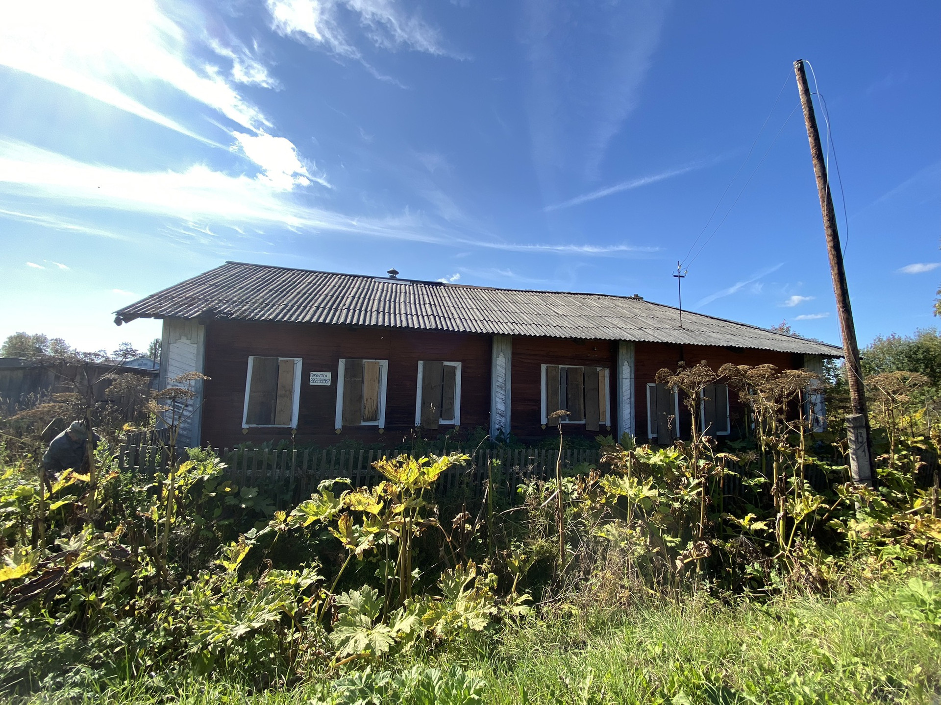 В одной части жили, печное отопление, во второй не жили. Между 2 комнатами есть комната-кухня, есть сарай, баня, колодец рядом. Асфальтированная дорога, Недалеко речка