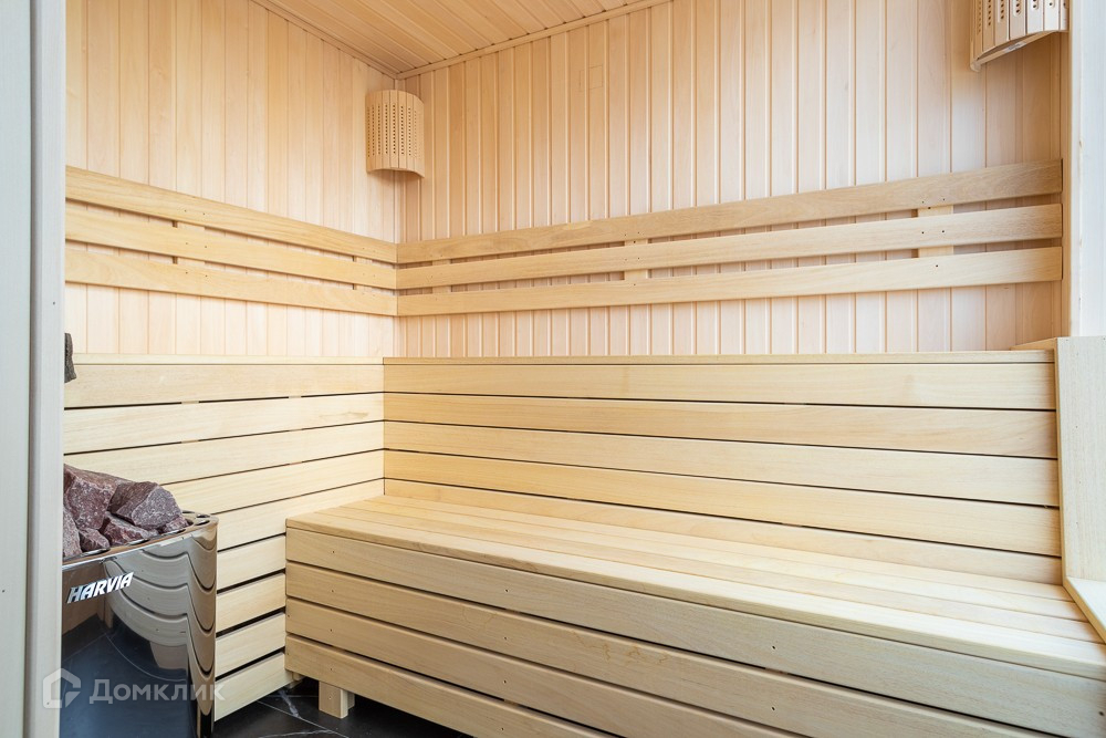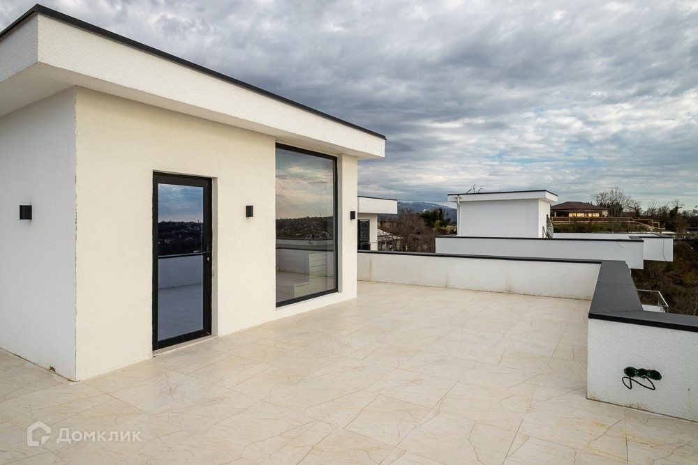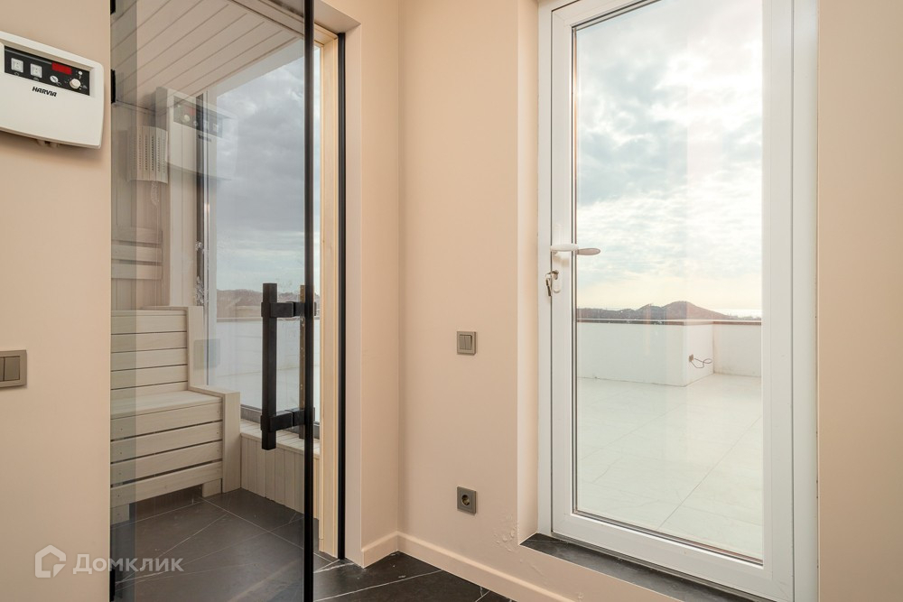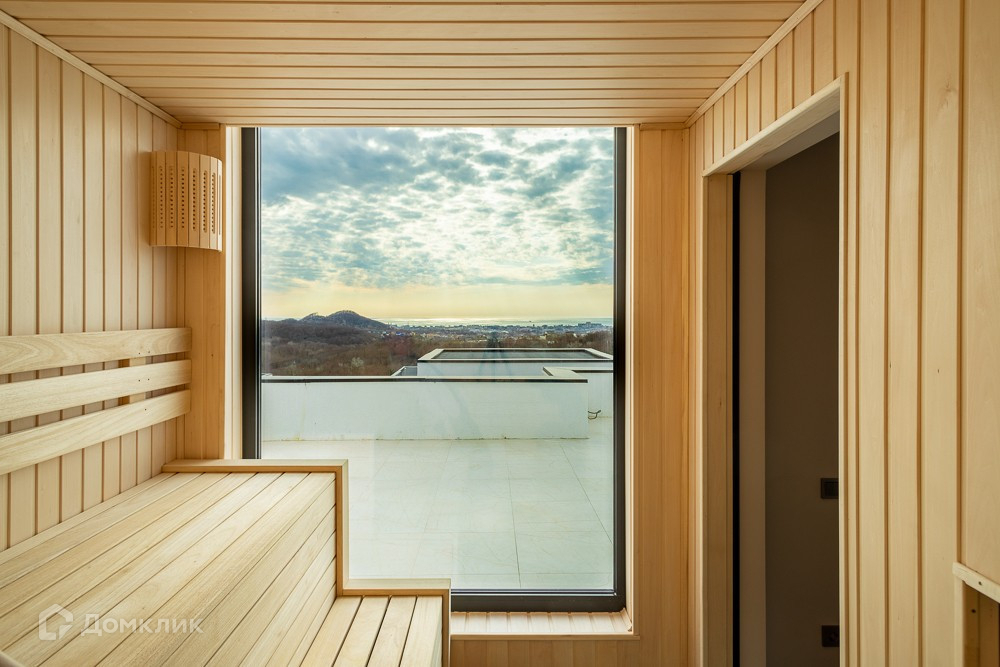 У коттеджа эксплуатируемая кровля: на ней расположен душ и выход в сауну, с панорамным остеклением и видом на море.