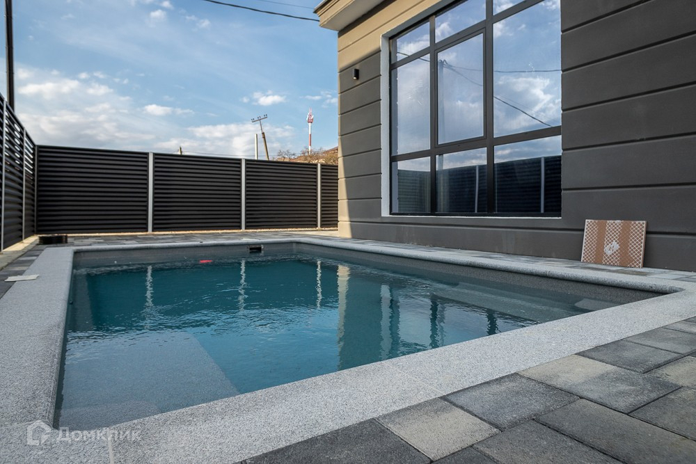 Индивидуальный въезд на территорию коттеджа, зона парковки для автомобиля, подогреваемый бассейн, выполнен ландшафтный дизайн территории.