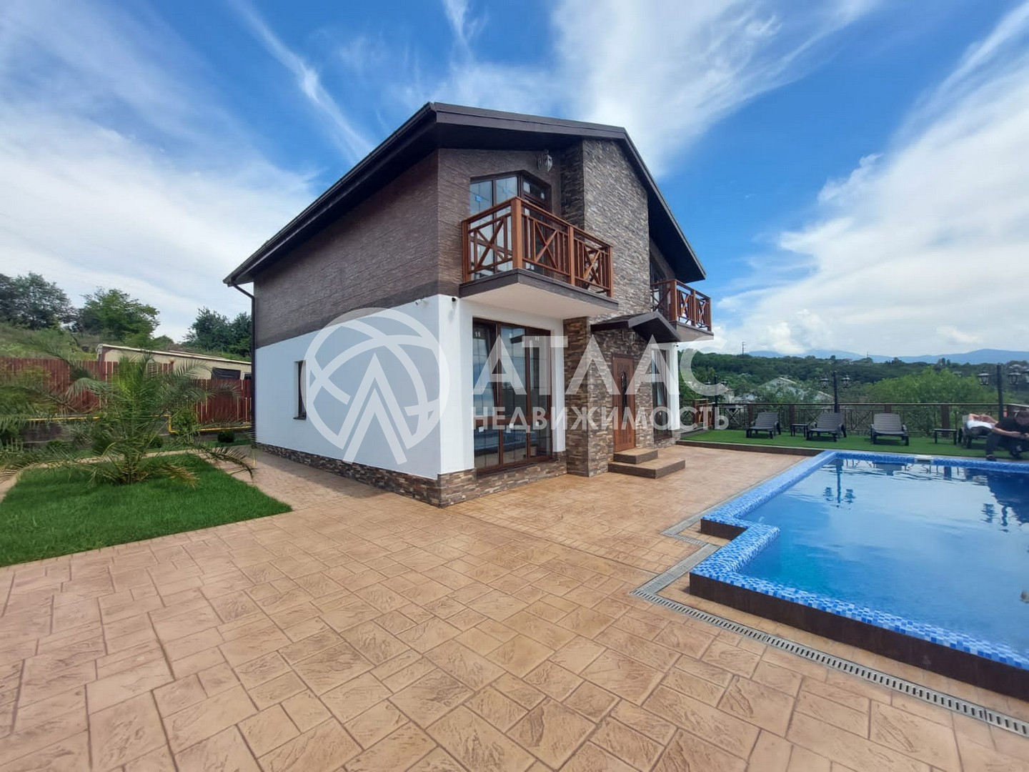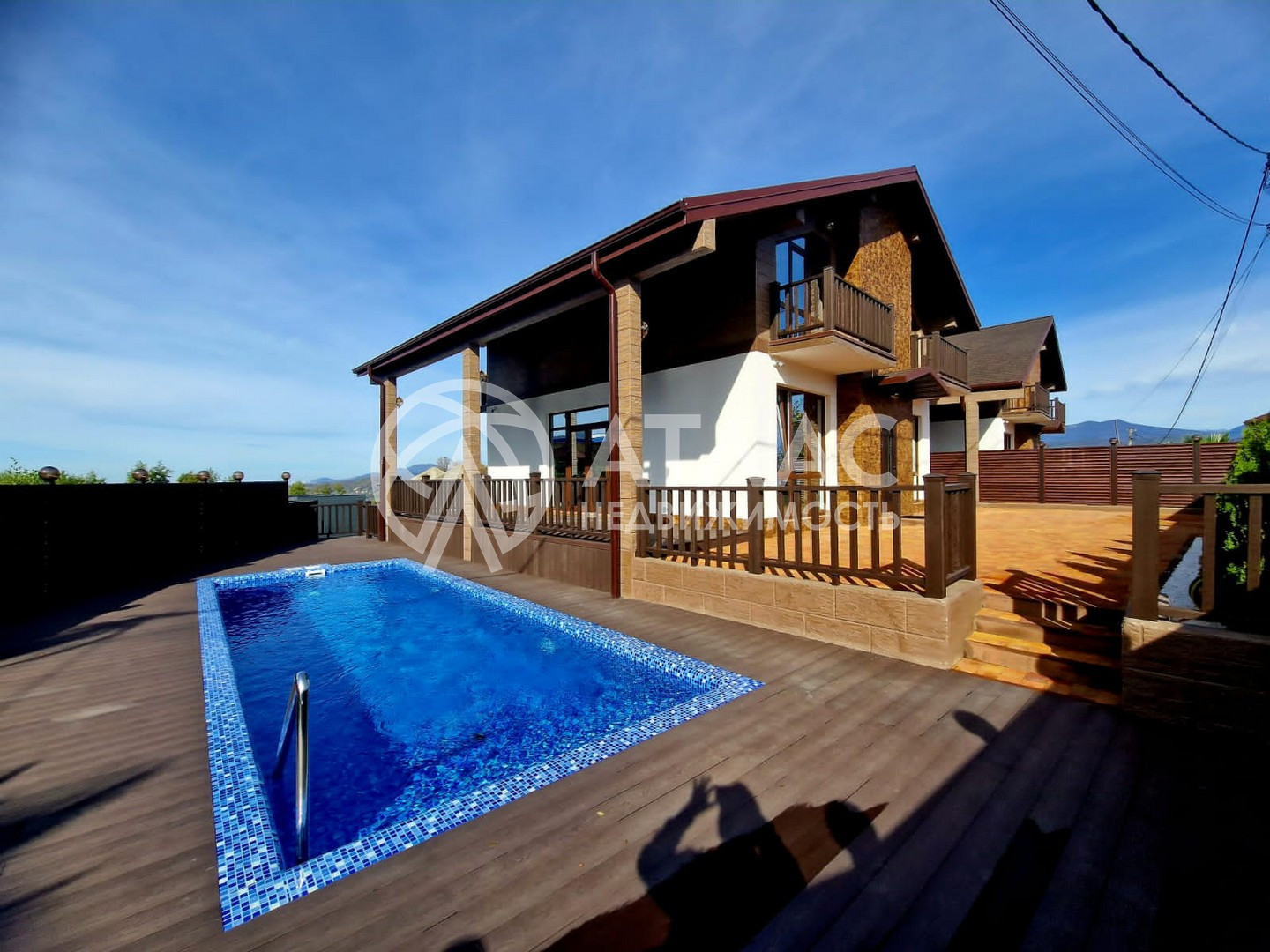 Дом в стиле шале идеально вписывается в окружающий пейзаж и вид на горы.