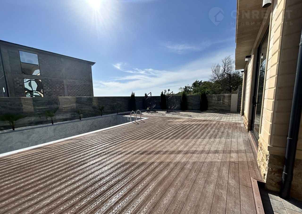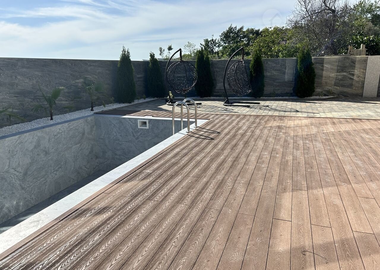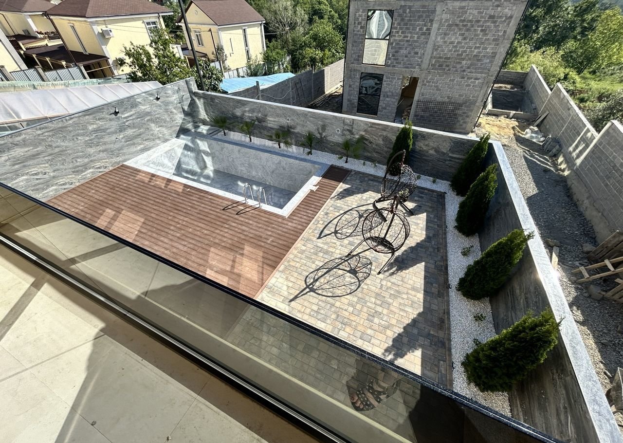 На большой участок в 5 соток выполено ландшафтное озеленение и освещение всего участка: 1-ый уровень, большой крытое парковочное место , зона хранение, зарядка для электромобиля и гостевое парковочное место. 2-ой уровень - зона хранения под лестницей, сам дом. 3-ьий уровень зона отдыха , большой подогреваемый бассейн с видом на горы и мангальная зона.
