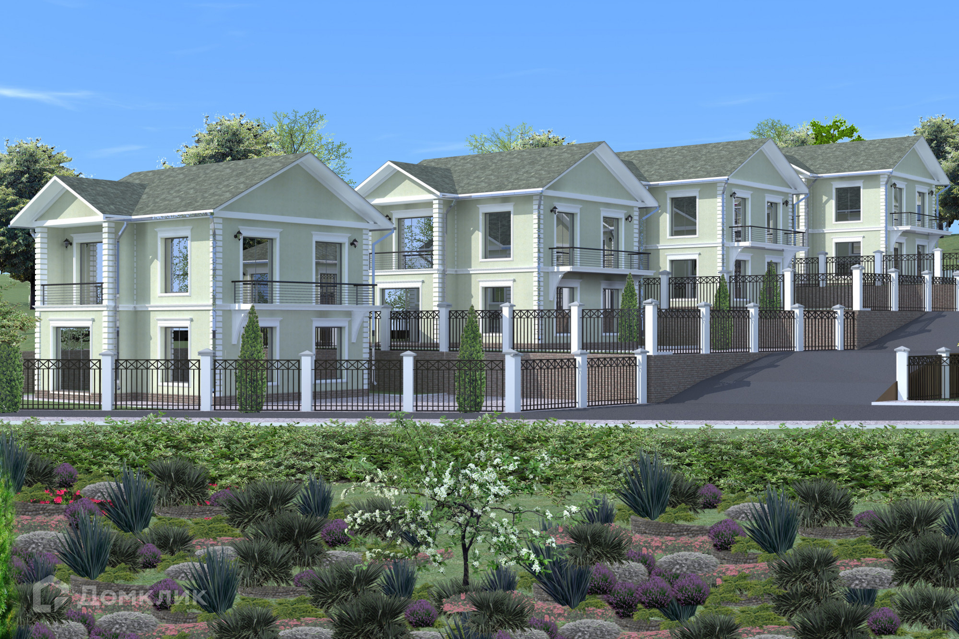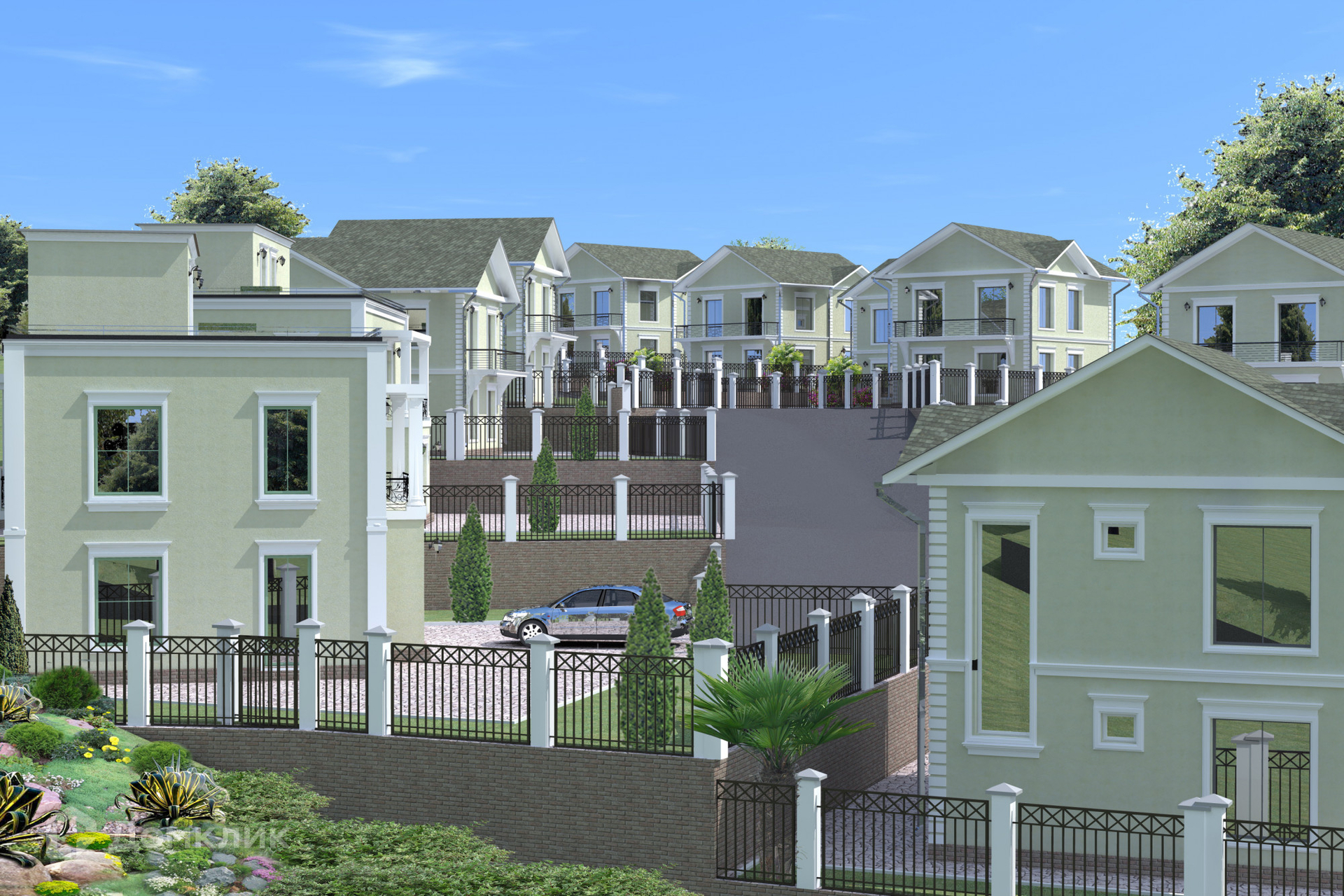 Придомовая территория каждого коттеджа огорожена и вымощена брусчаткой, а также
