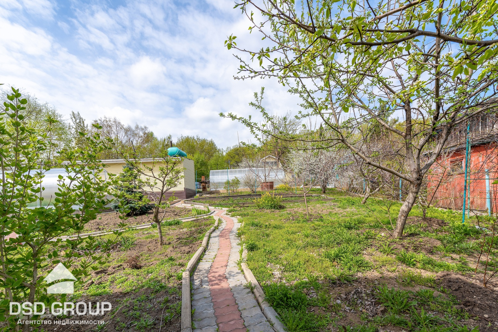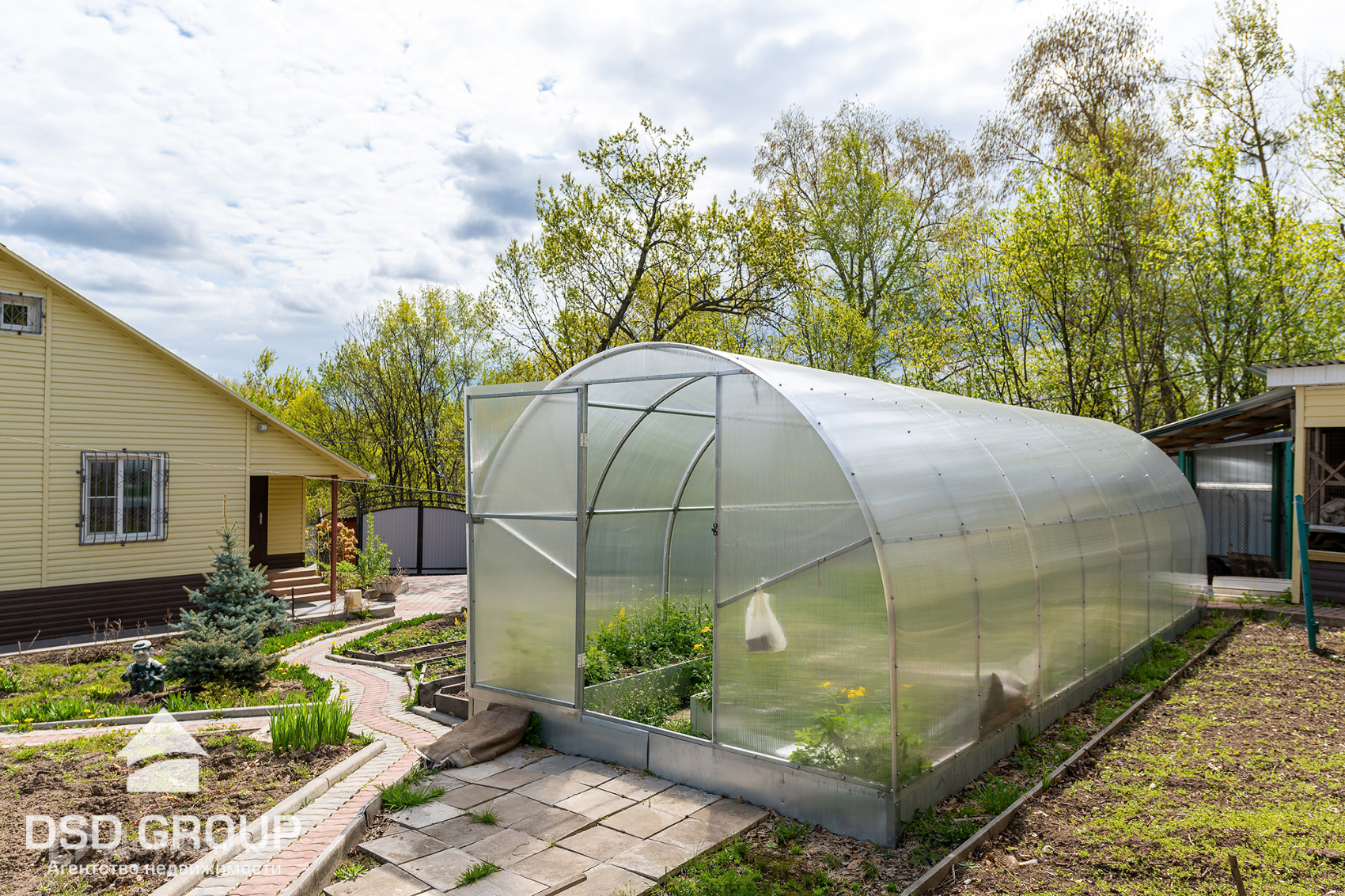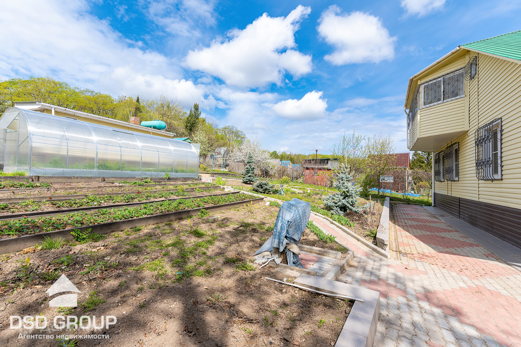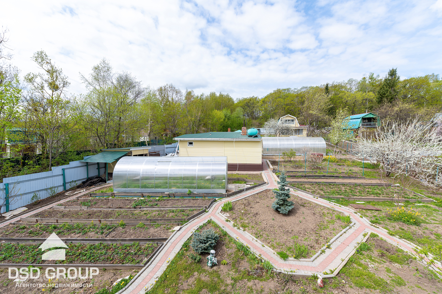 11. на участке имеется плодовые деревья и кустарники: слива, вишня, красная и черная смородина, малина, яблоня, абрикос, груша, черная рябина, виноград сортовой и дикий, малина, клубника, голубая Ель;