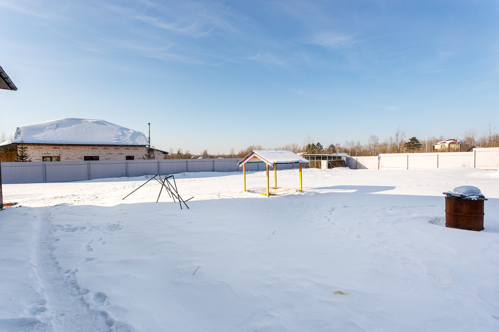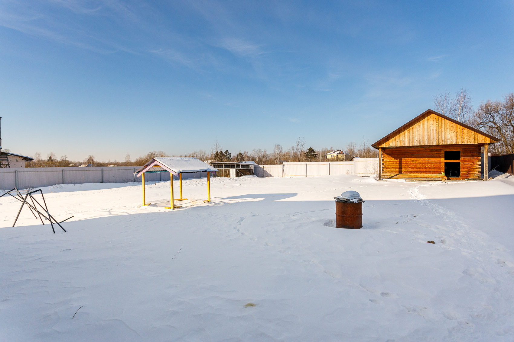 На территории есть почти готовая баня, построена на бетонной плите, из бруса.