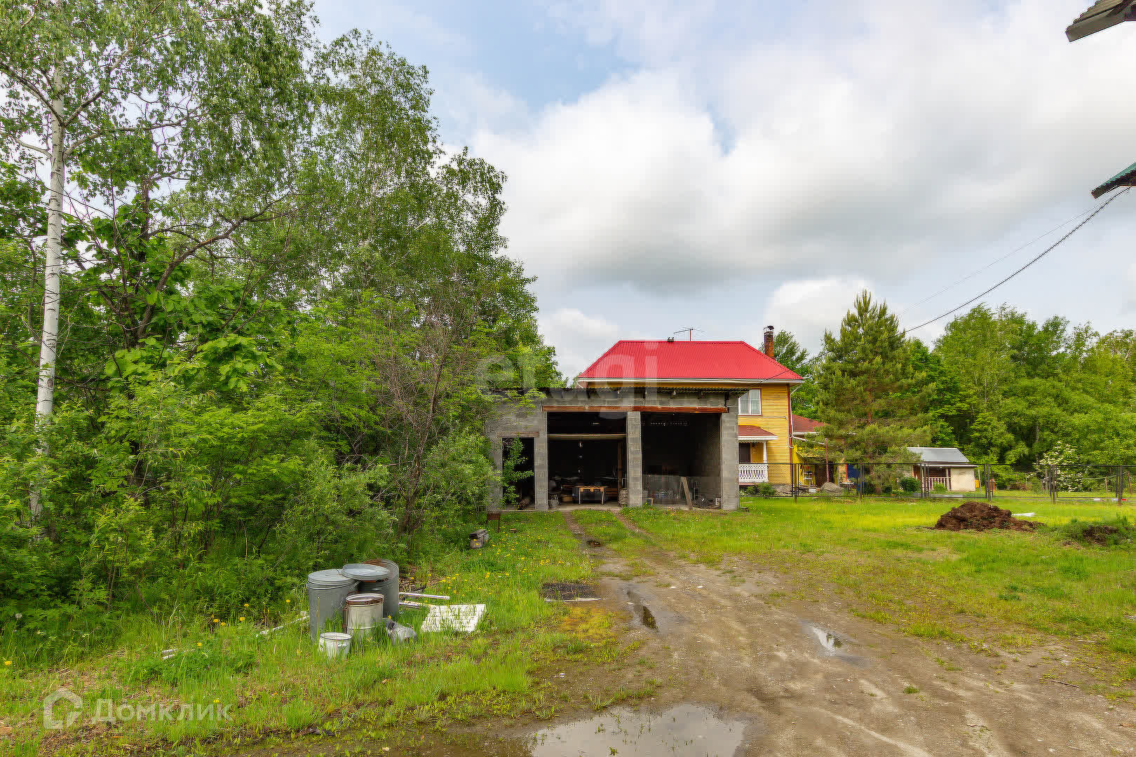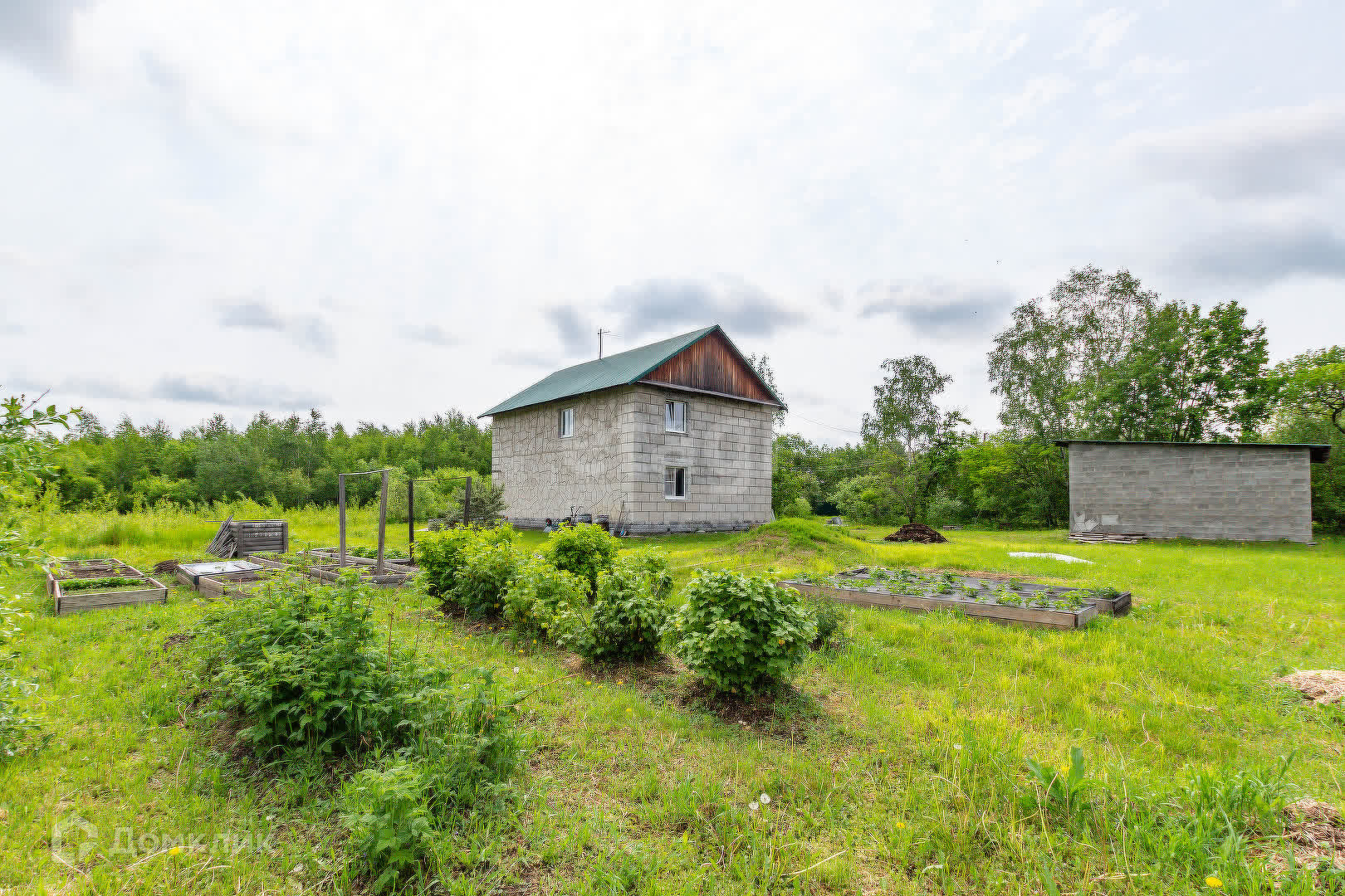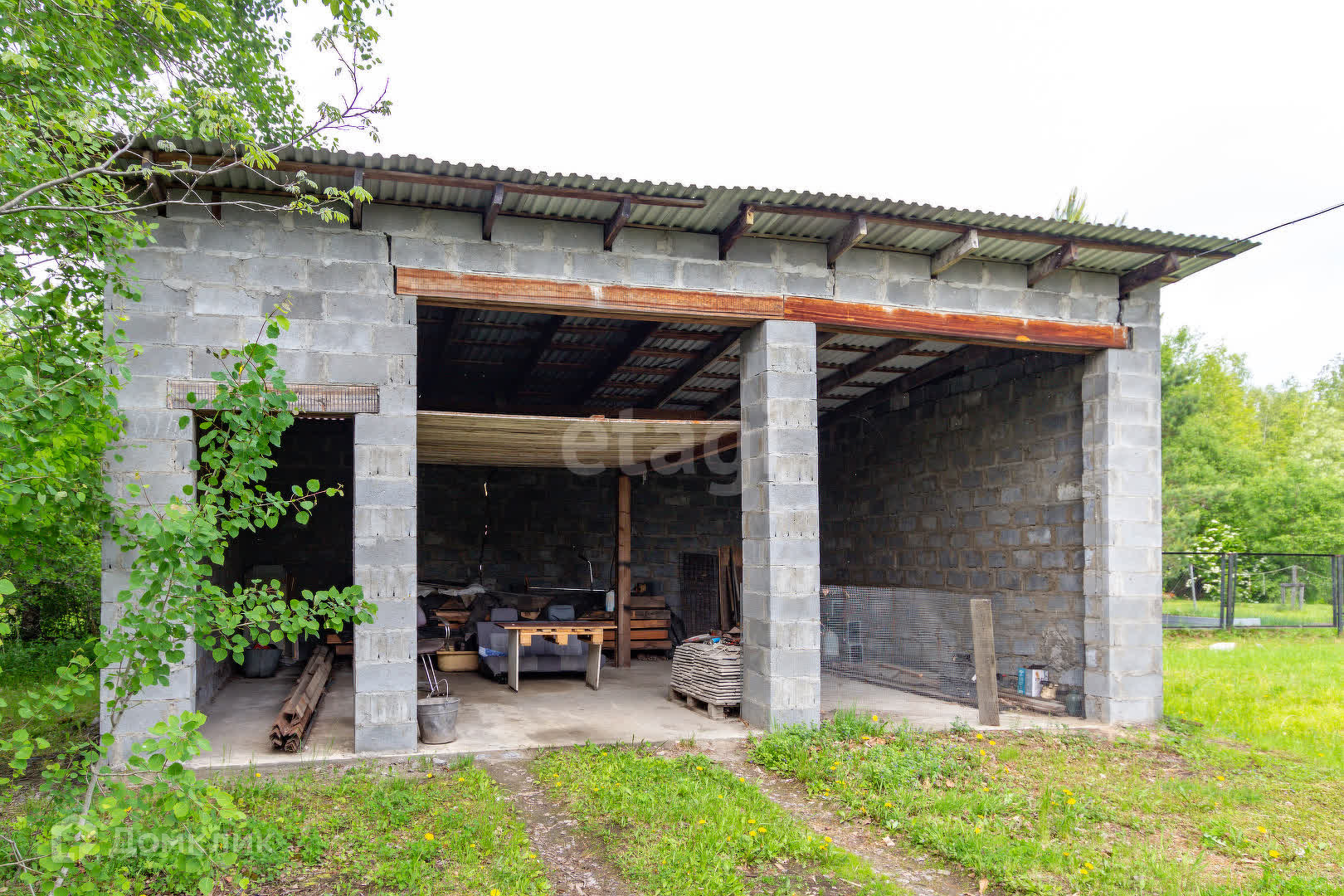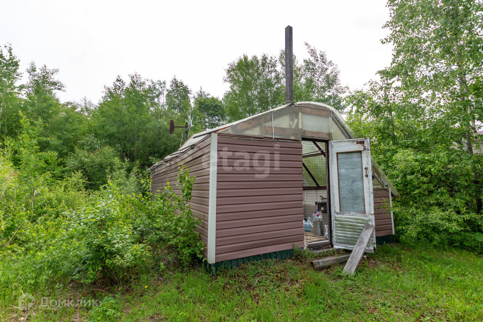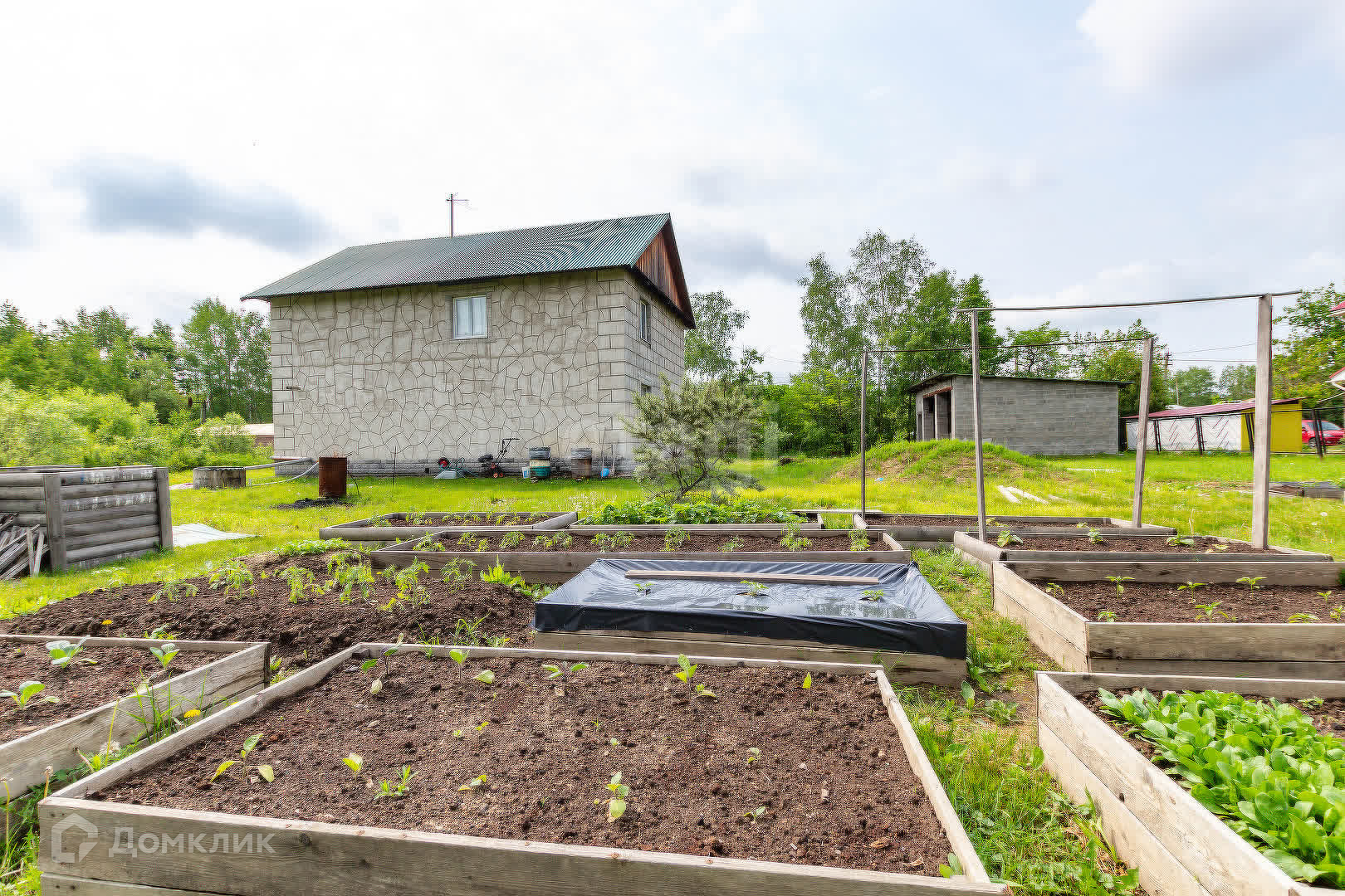 На территории находится гараж и теплица. Так же высажены деревья яблоня и груша, кустарники малины.