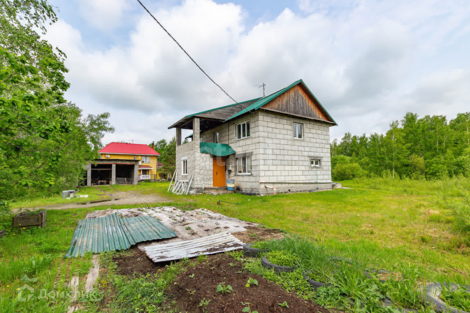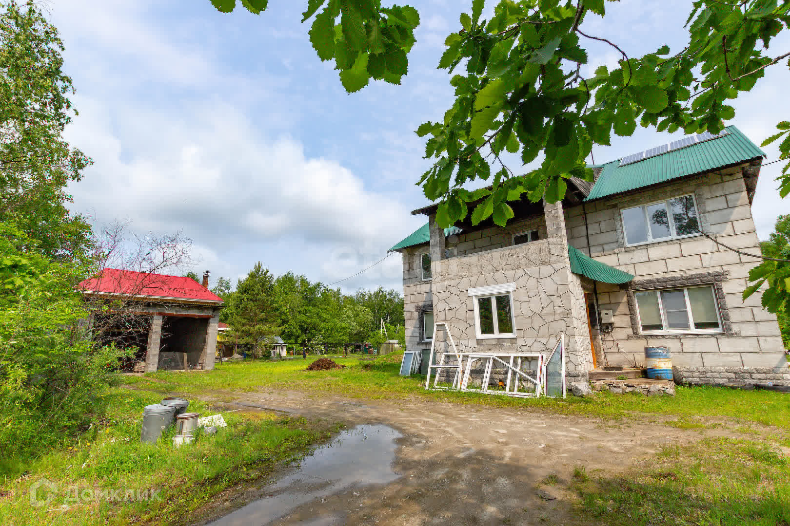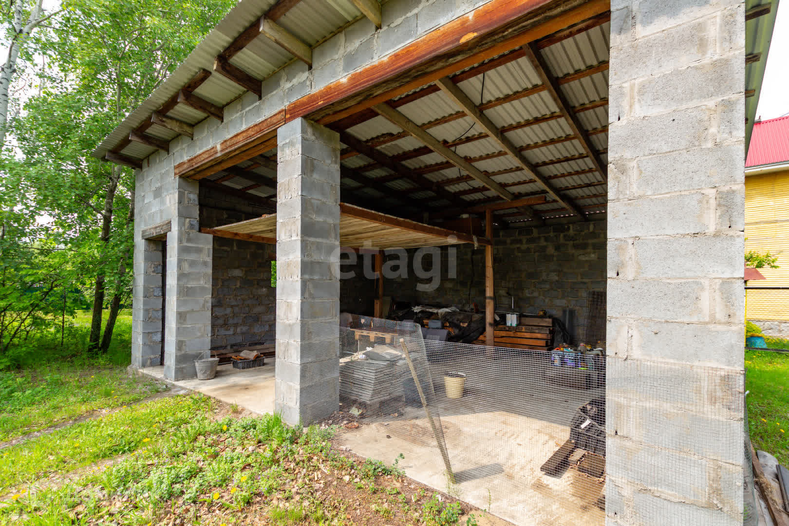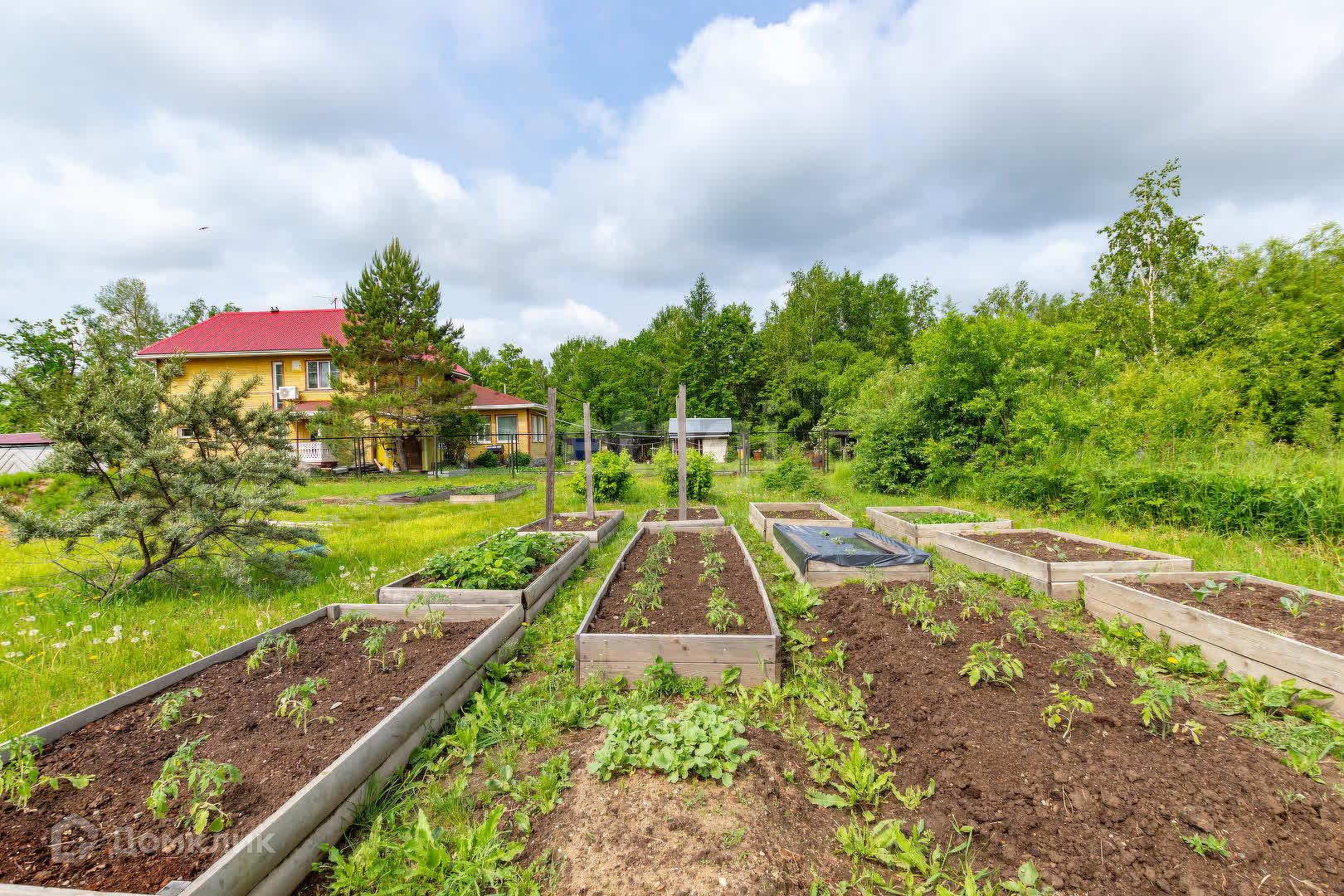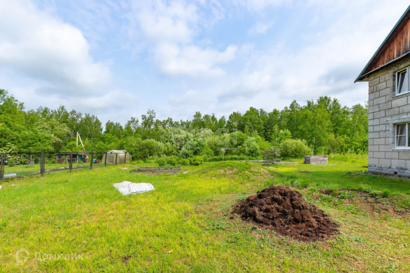 На территории находится гараж и теплица. Так же высажены деревья яблоня и груша, кустарники малины.