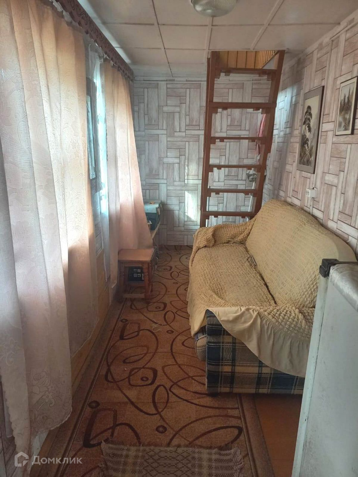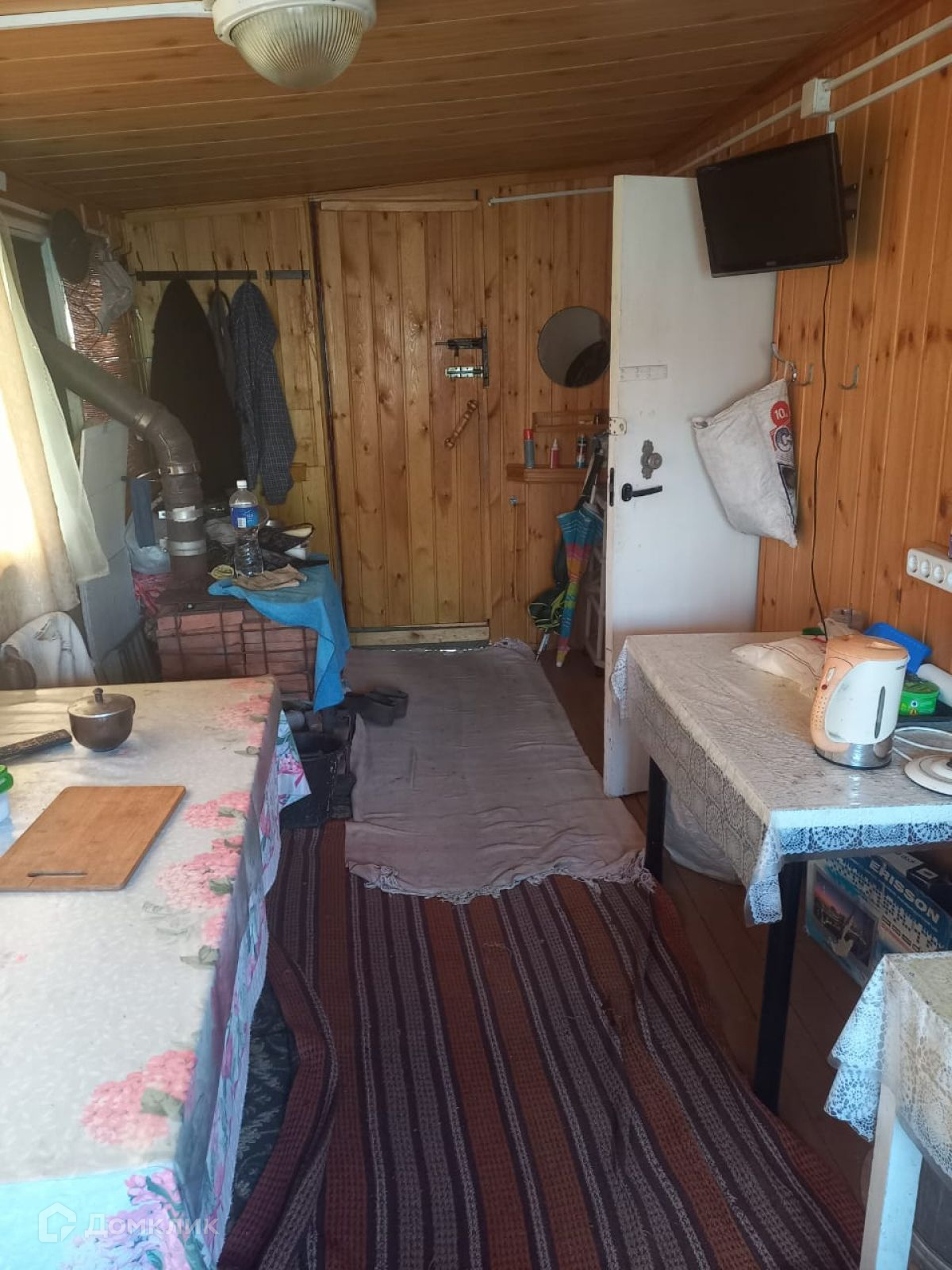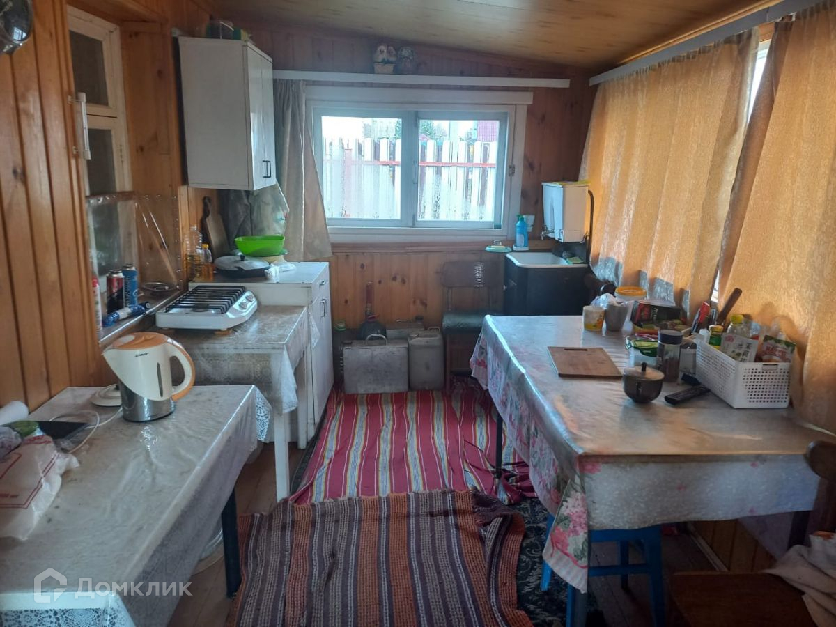 Дом из бруса на постоянном фундаменте (ж/б плита) обшит сайдингом, состоит из комнаты внизу и жилой мансарды. К дому пристроена веранда с печкой. Электричество в дом проведено, есть газовый баллон. Все в очень хорошем состоянии. Здесь вполне можно жить всей семьей в летнее время года.