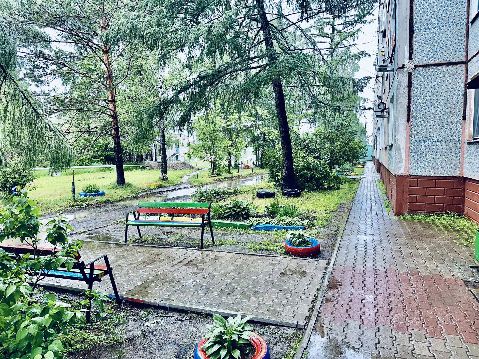 Ухоженный двор с новой детской площадкой и благоустройством.