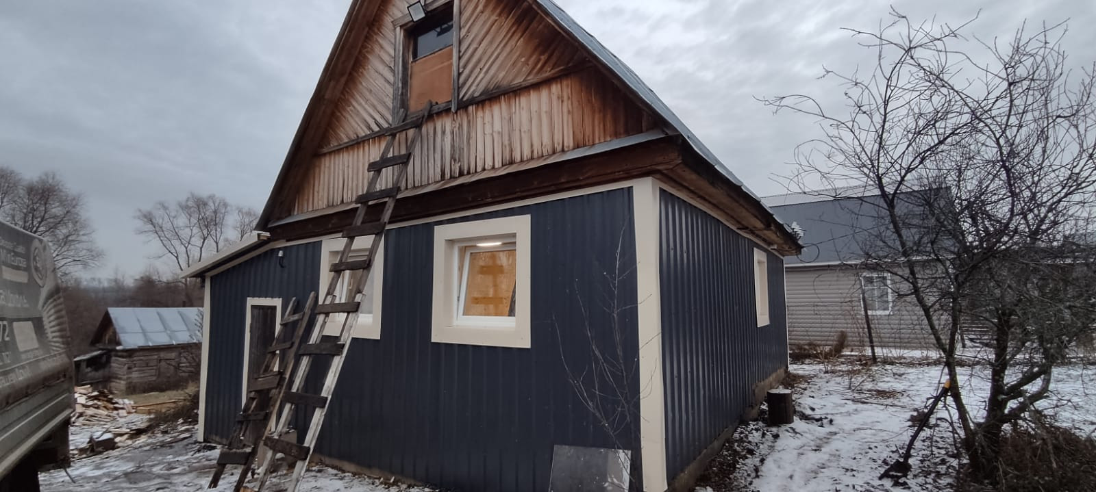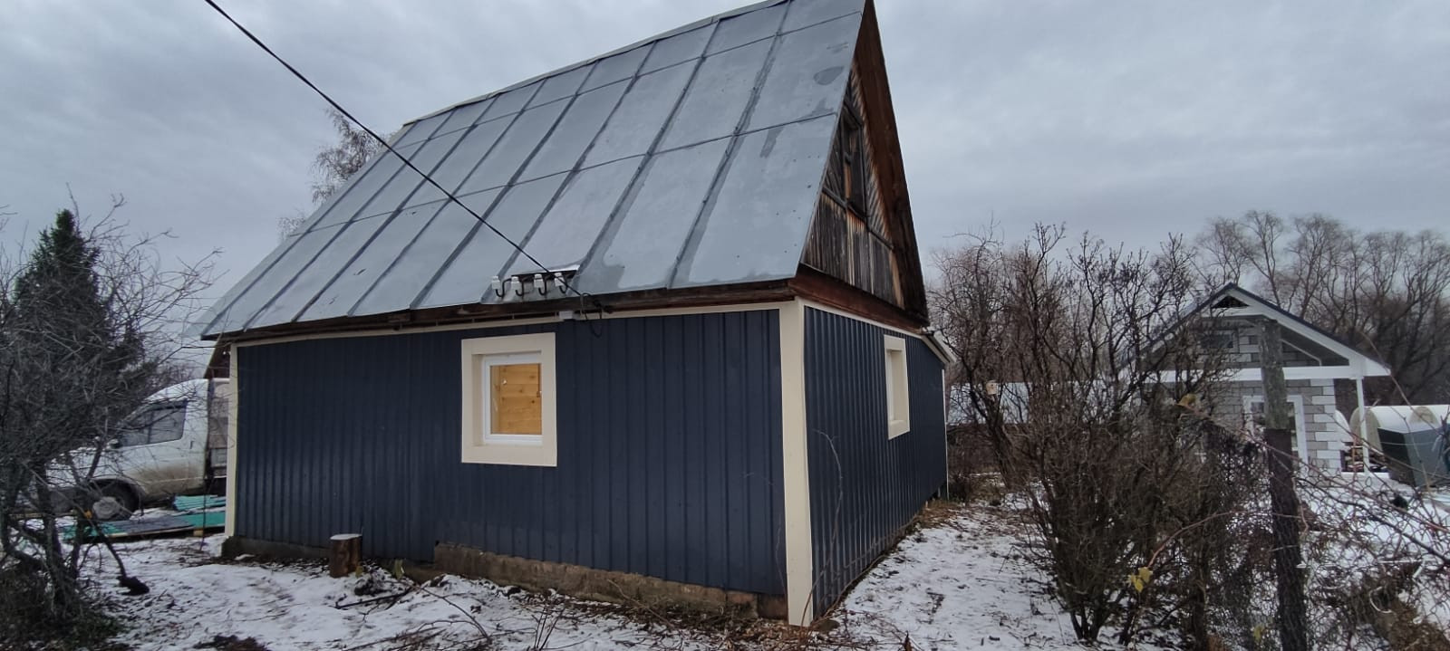 Стены – бревна, обшиты профнастилом