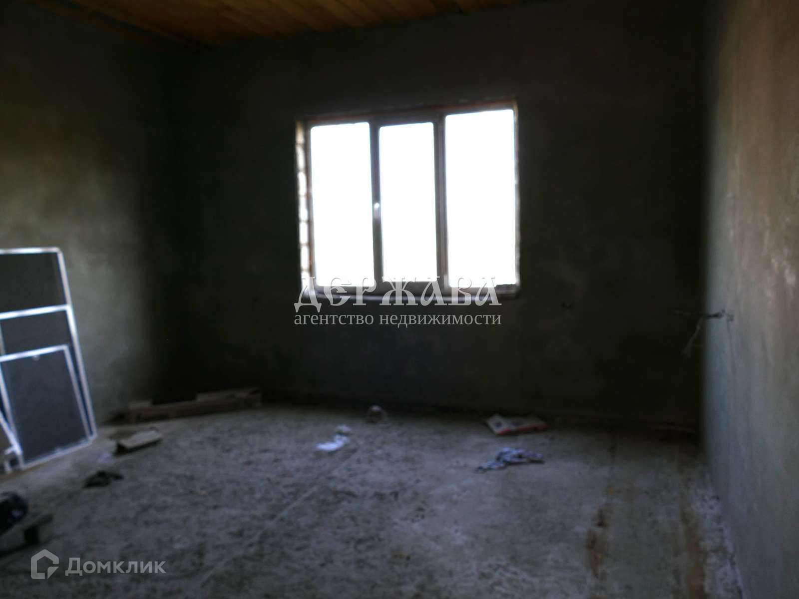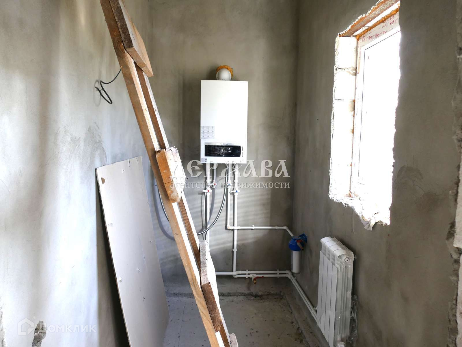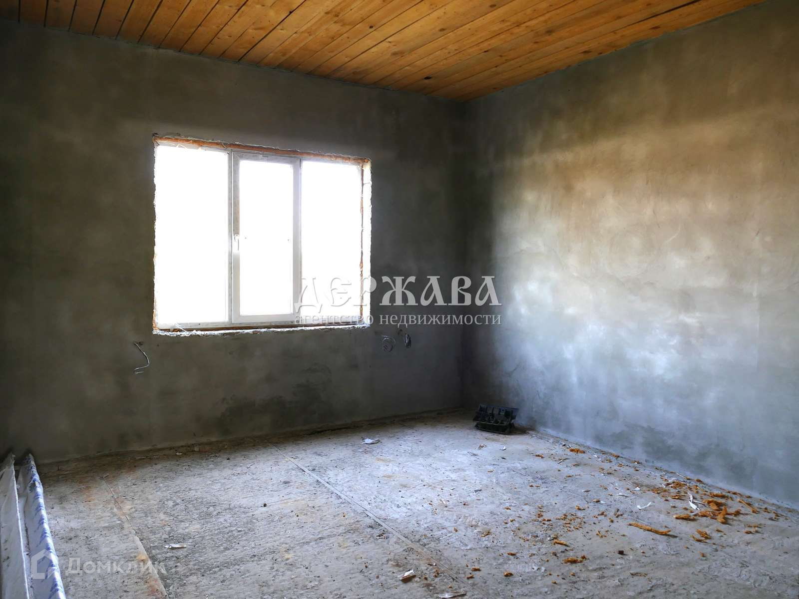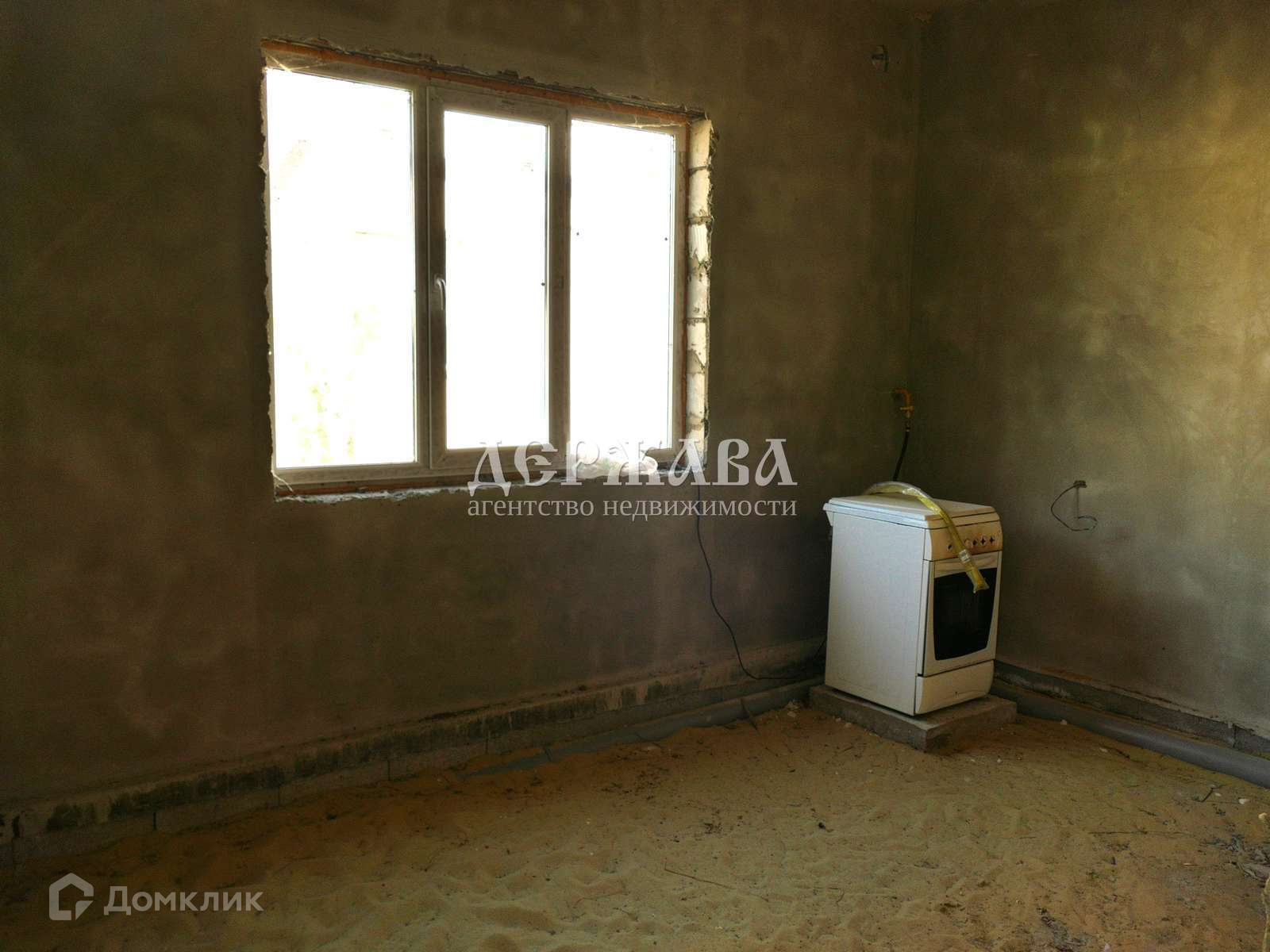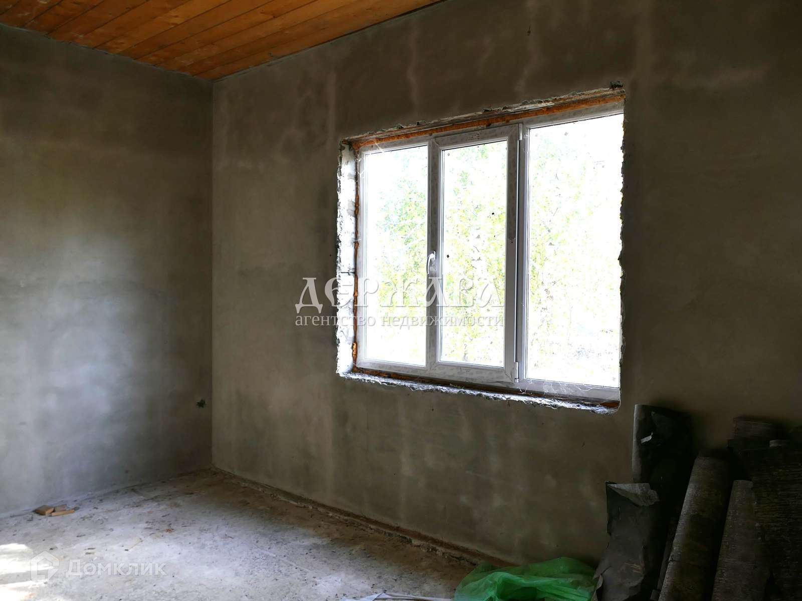 Залит черновой пол, потолки подшиты, стены оштукатурены, выполнена разводка воды( но не подключена к водопроводу), газ и свет в доме, установлен котел.