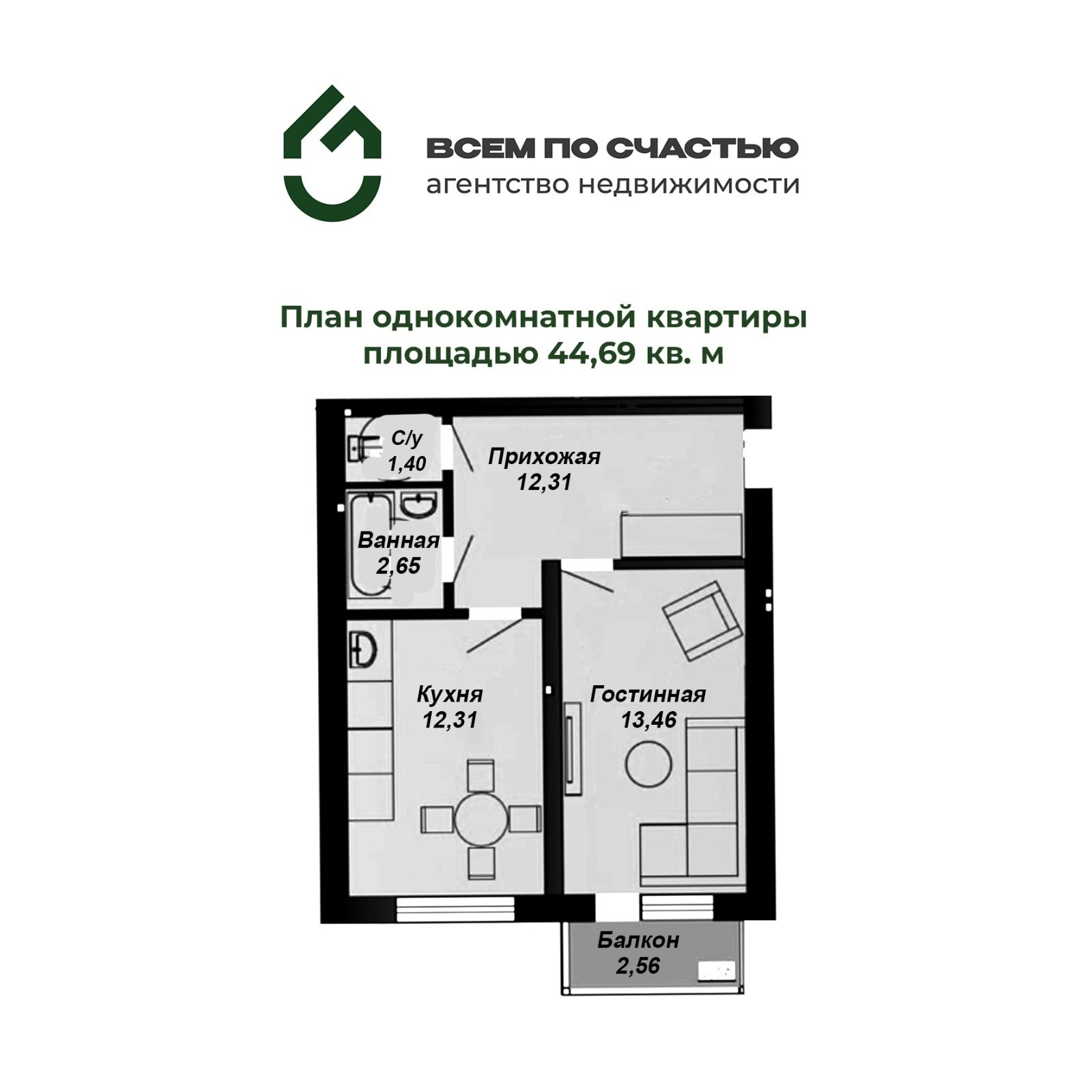 ✅Площадь квартиры 44.69 кв.м