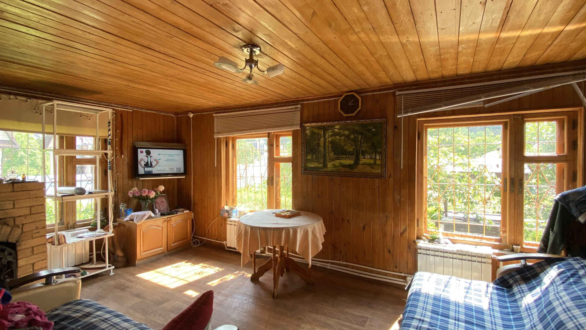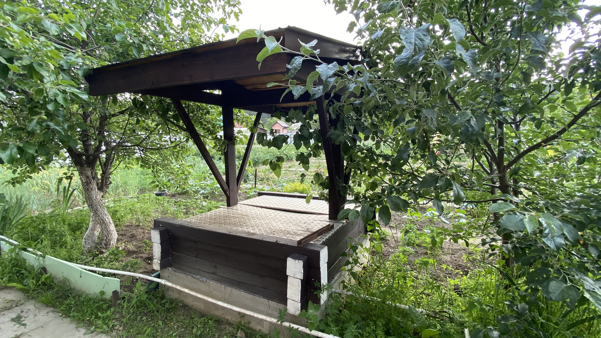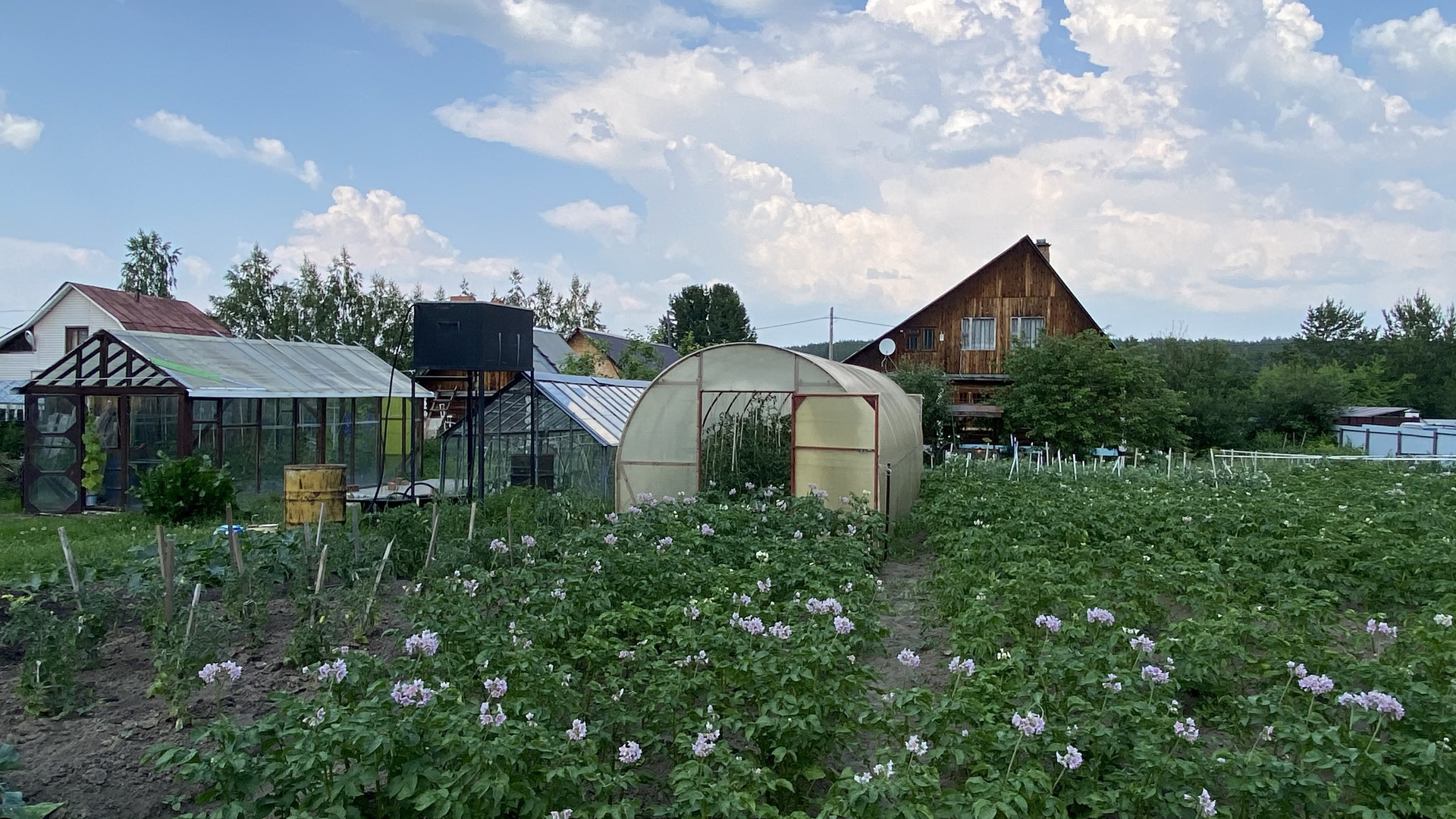 На участке много плодовых деревьев, кустарников, насаждений и красивых цветов.