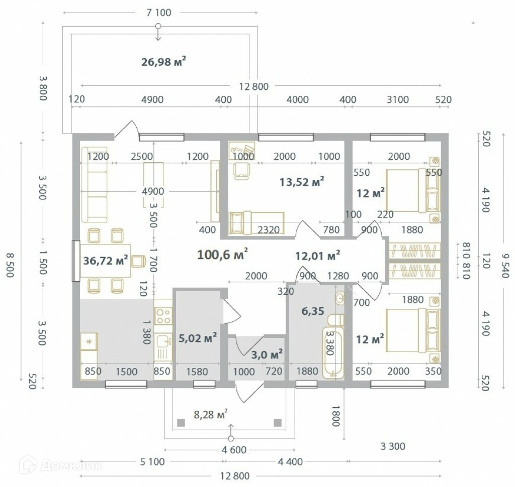 Современный одноэтажный дом 100,6 кв.м. для рациональной семьи, включает в себя светлую кухню-гостиную с выходом на шикарную террасу и три спальные комнаты, санузел, холл, котельную. Отличной особенностью проекта, привлекающей внимание, является наличие больших окон в пол. Фасад выполнен в исполнении в керамическом кирпиче. Дом расположен на территории закрытого коттеджного поселка "Сибирские владения". На территории парк, детские игровые площадки. Дорога заасфальтирована, также к каждому дому подъездные пути, коммуникации, газ, вода, электричество.      Номер предложения: 9178.