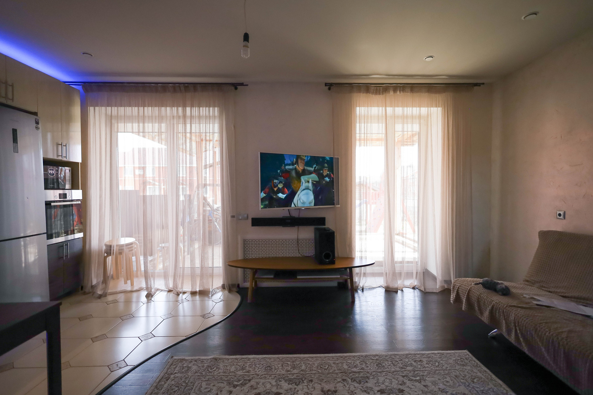 ✔️просторная кухня-гостиная с панорамными окнами (за счёт этого много света)
