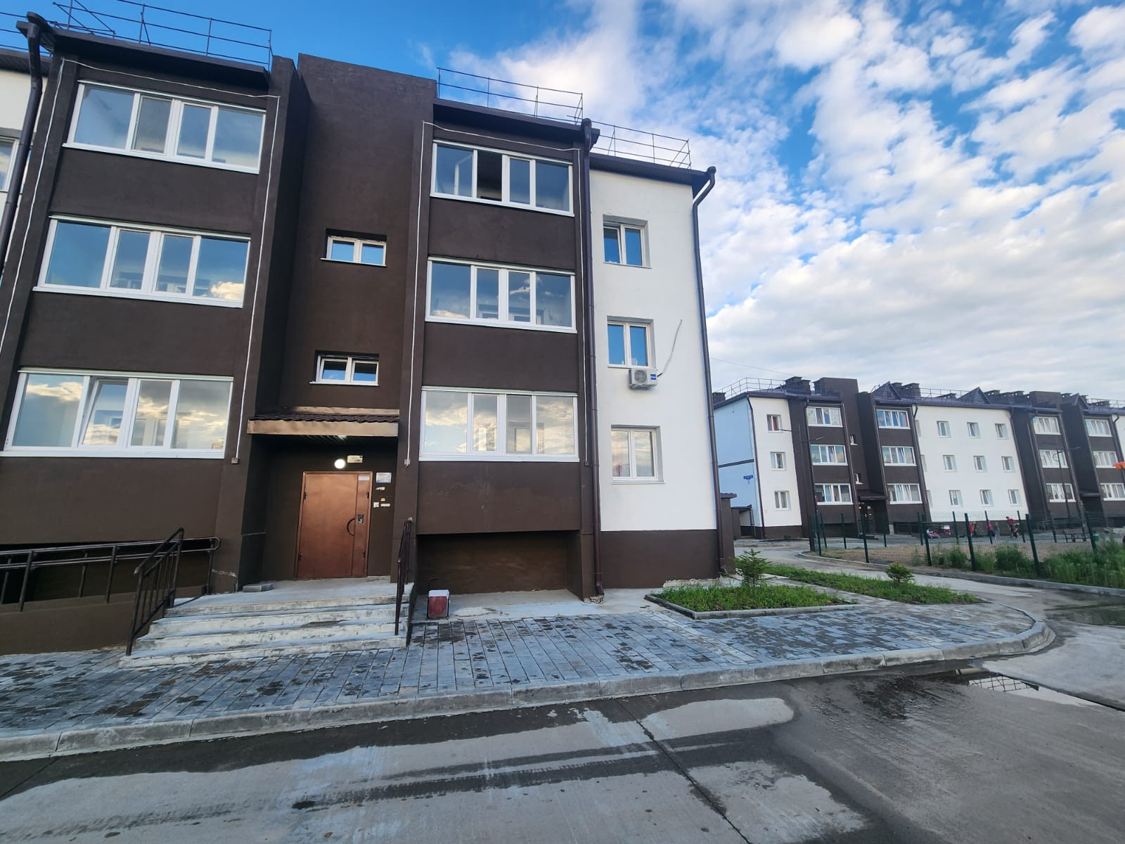 Благоустройство: выполнена парковка, игровая детская площадка, отделенная от проезжей части, озеленение территории: сохранено существующие деревья, высажены цветущие фруктово-ягодные кустарники, посеяны газоны.