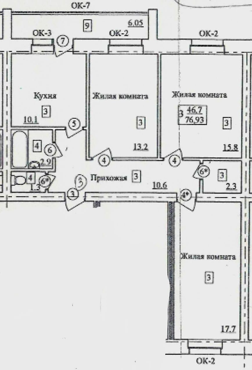 Квартира расположена на  3 этаже.  Площадь квартиры  - 76,90  кв.м., большая прихожая, сан узел раздельный, комнаты – 15,80+17,70 +13,2 кв.м., кухня – 10,10  кв.м. большая лоджия на два окна.