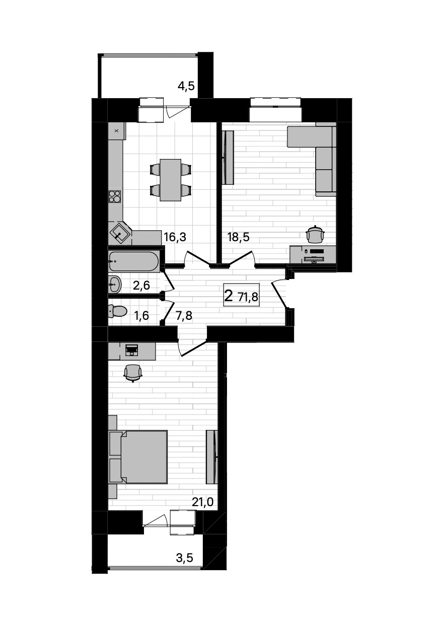 жилая комнаты – 21,00 + 18,50 кв.м.,