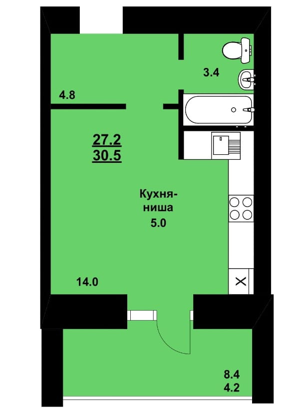 Общая площадь 30.7 м2