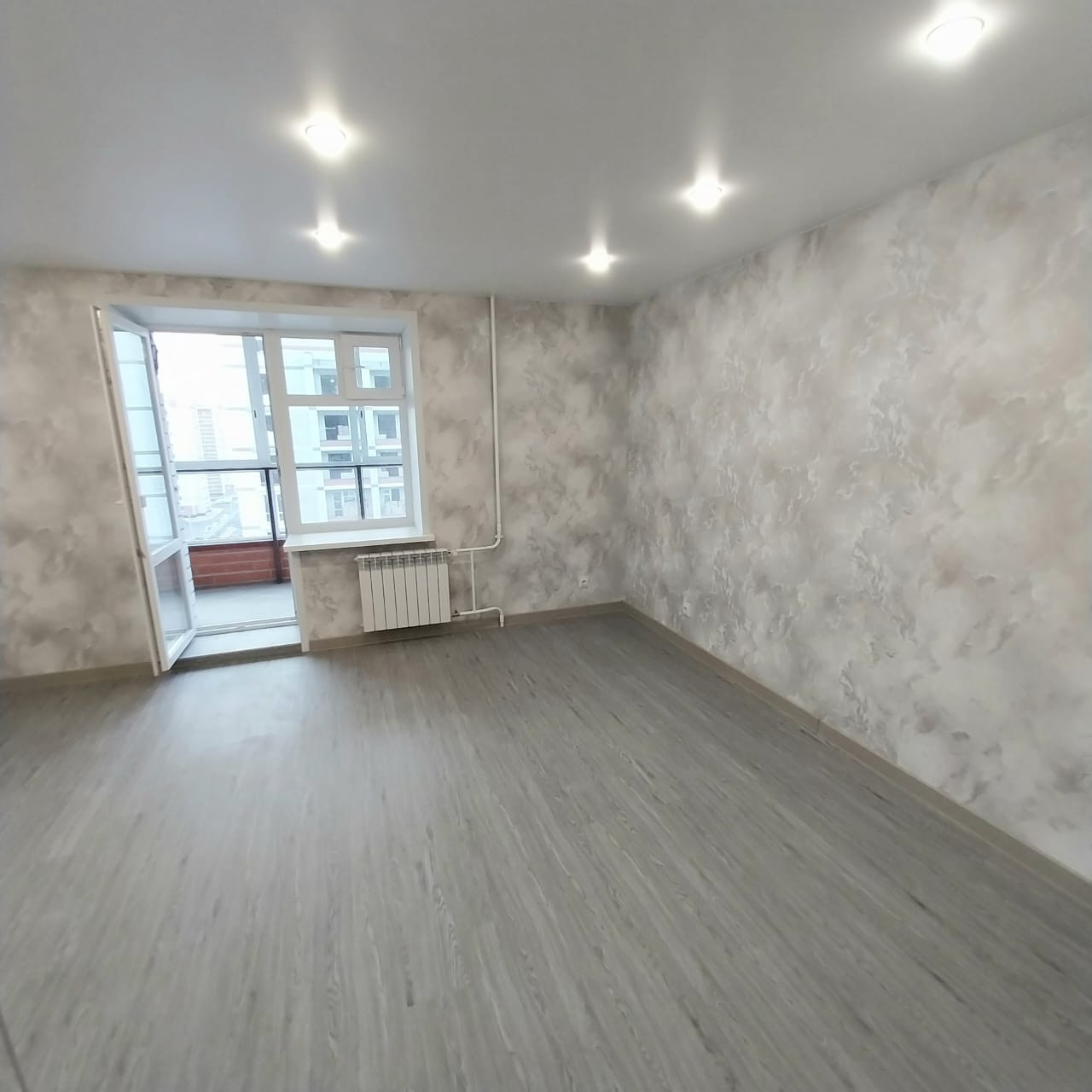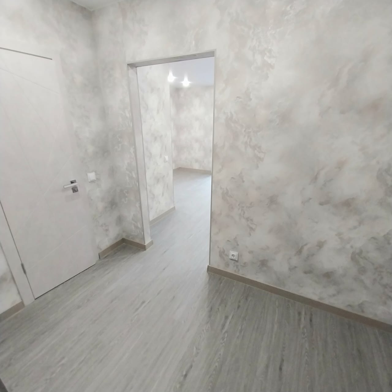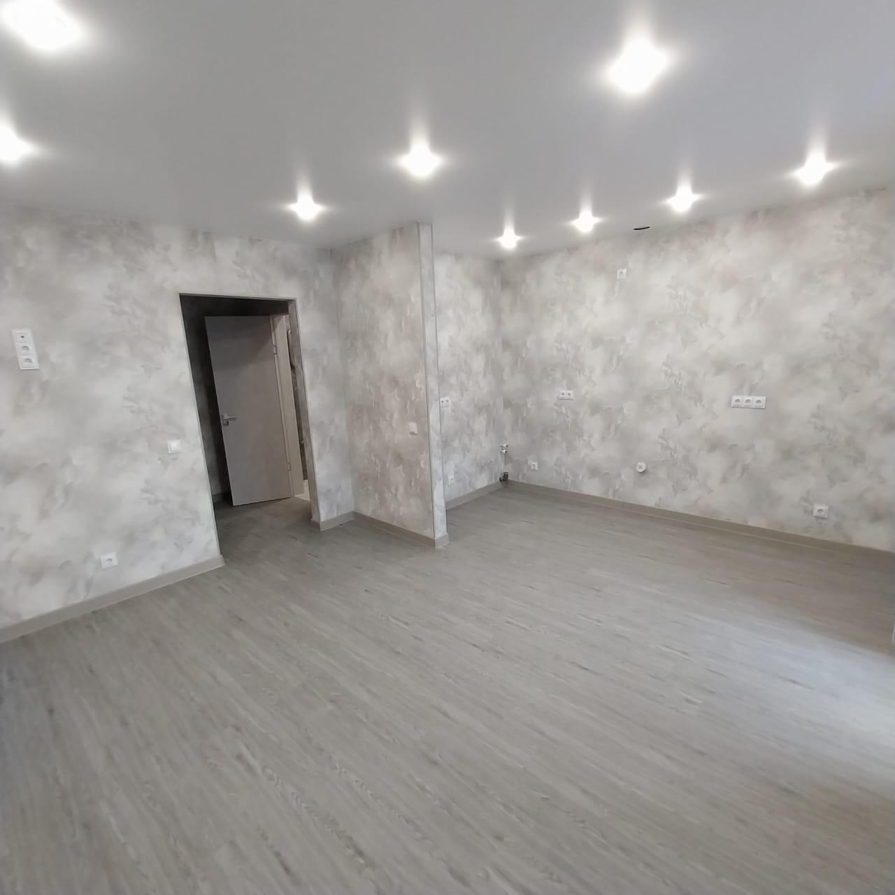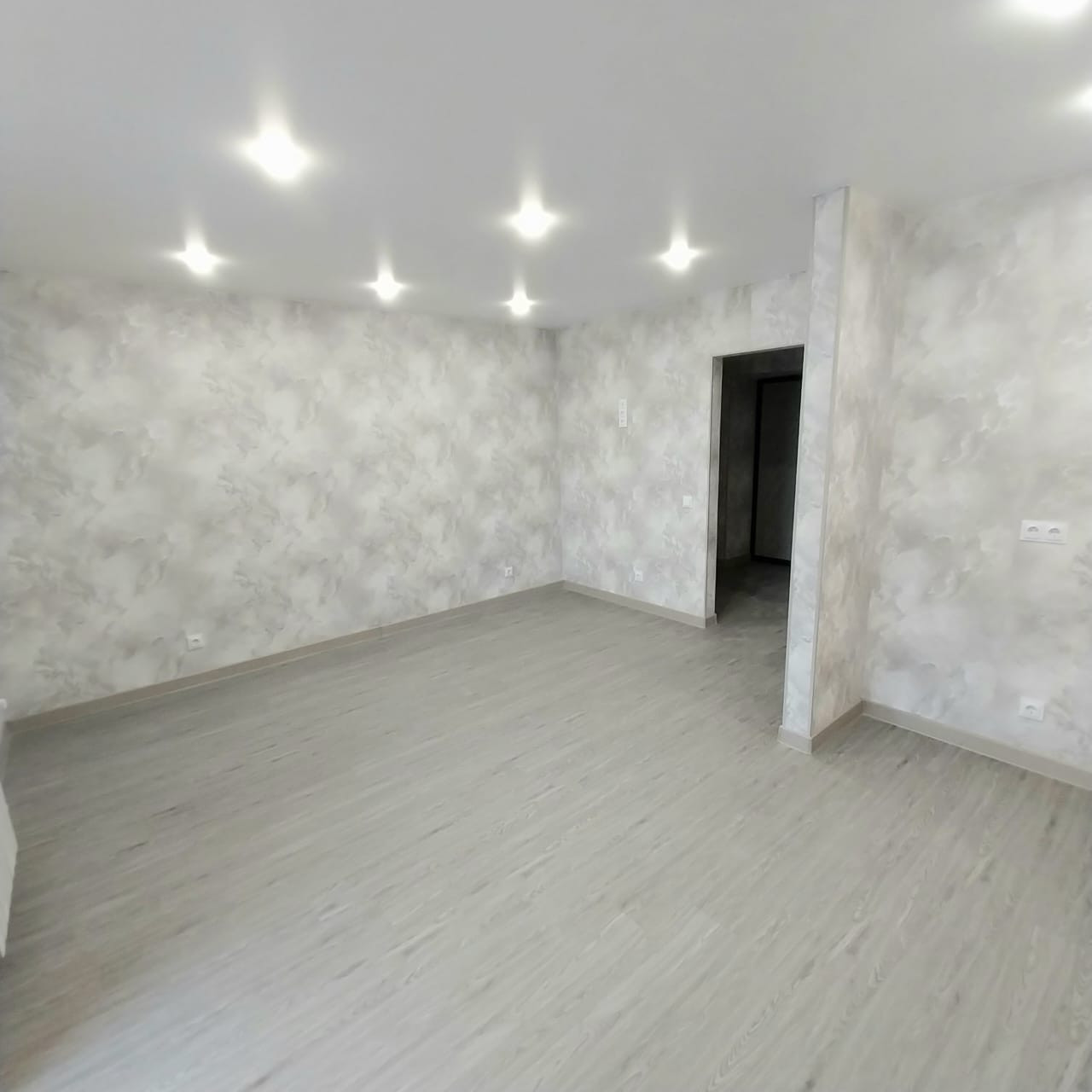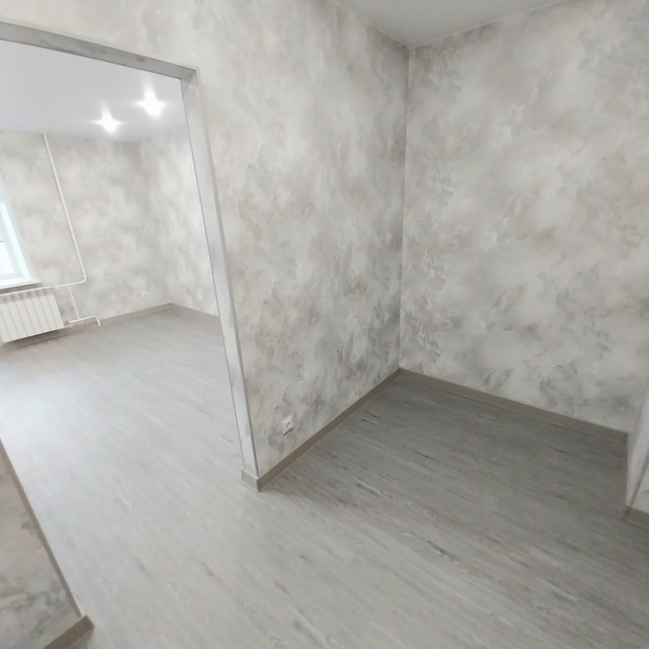 Обои в светлых тонах, на полу прочный ламинат.