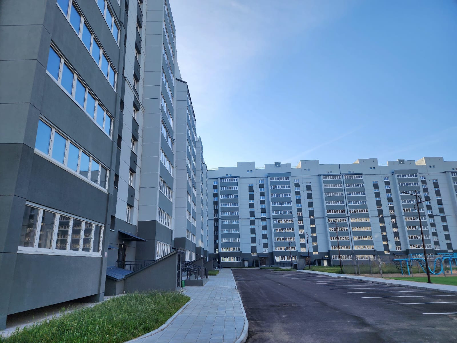 Благоустройство: парковка во дворе, игровая детская площадка, отделенная от проезжей части, озеленение территории: сохранено существующие деревья, высажены цветущие фруктово-ягодные кустарники, посеяны газоны.