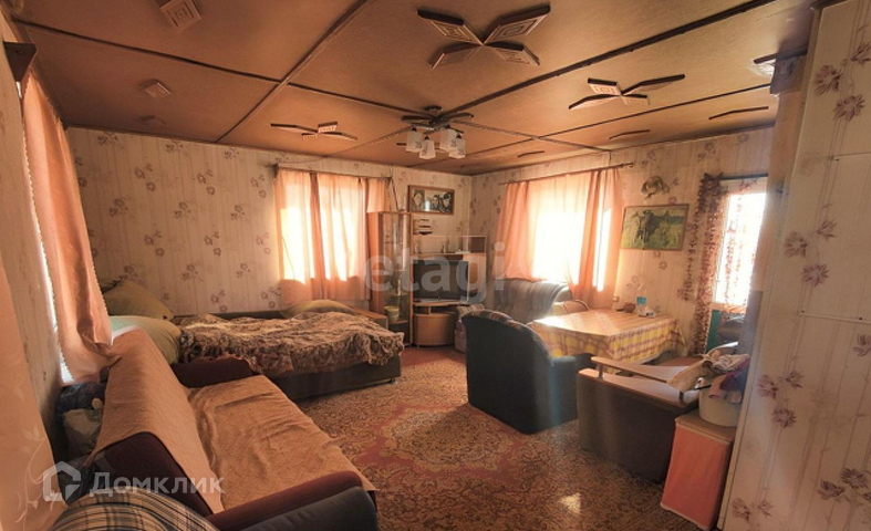 В доме гостиная, две спальни и кухонная зона, также имеется чердачное помещение, которое используется под хранение вещей. Отопление в доме печное. Все окна заменены на пластиковые, дом обшит профнастилом. Дом хорошо отапливается, поэтому, несмотря на большое количество помещений всегда уютно и тепло. Туалет находится на улице. Вся мебель и бытовая техника остается.