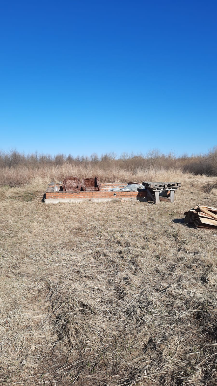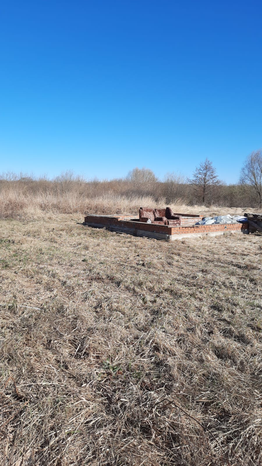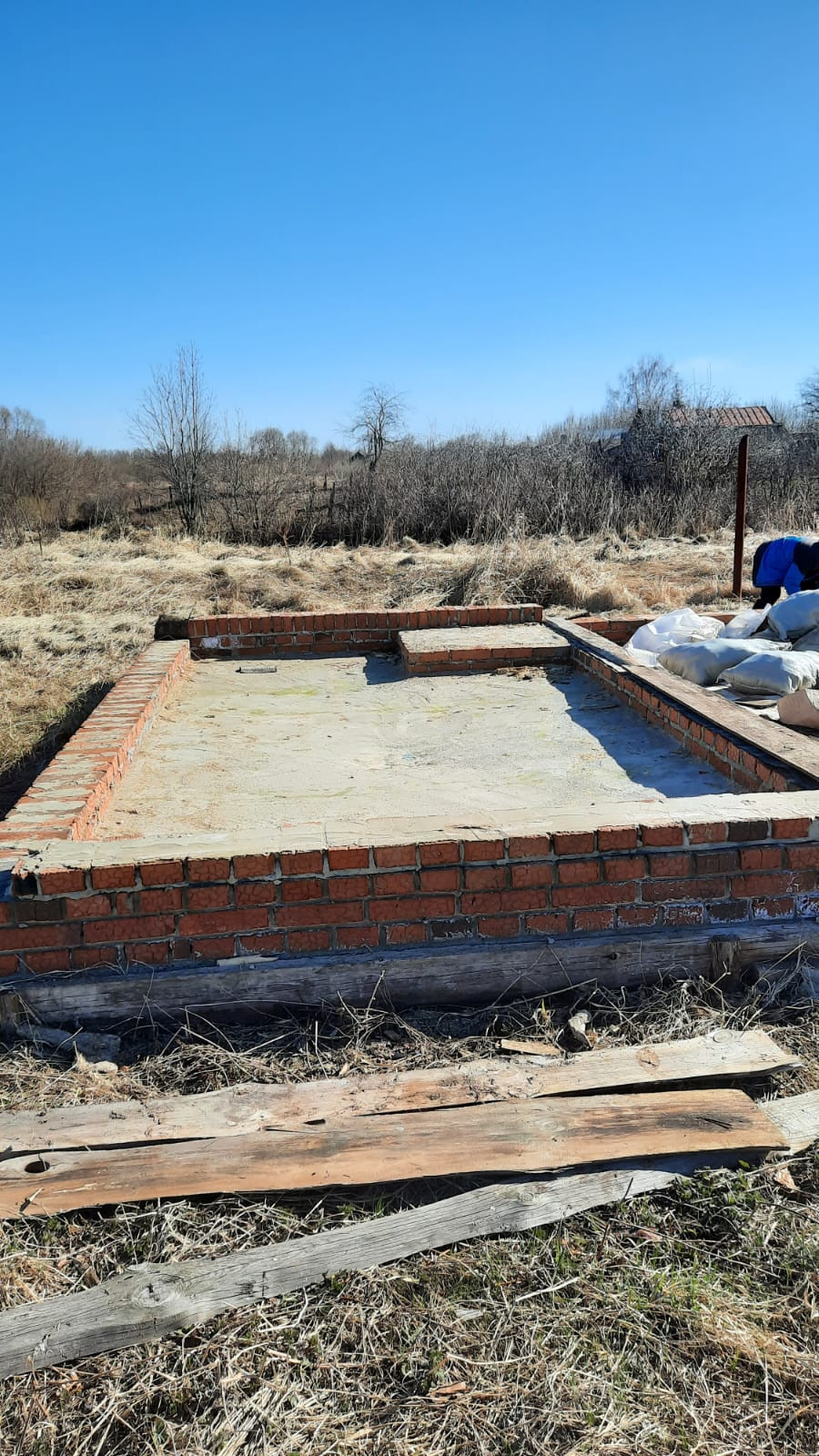 Фундамент имеет прямоугольную форму 5*6 метров с перегородкой посередине и забором на границе. Соседи подключены к газу, что значительно упрощает подключение к газу для будущего дома. Кроме того, на участке уже имеется электричество.