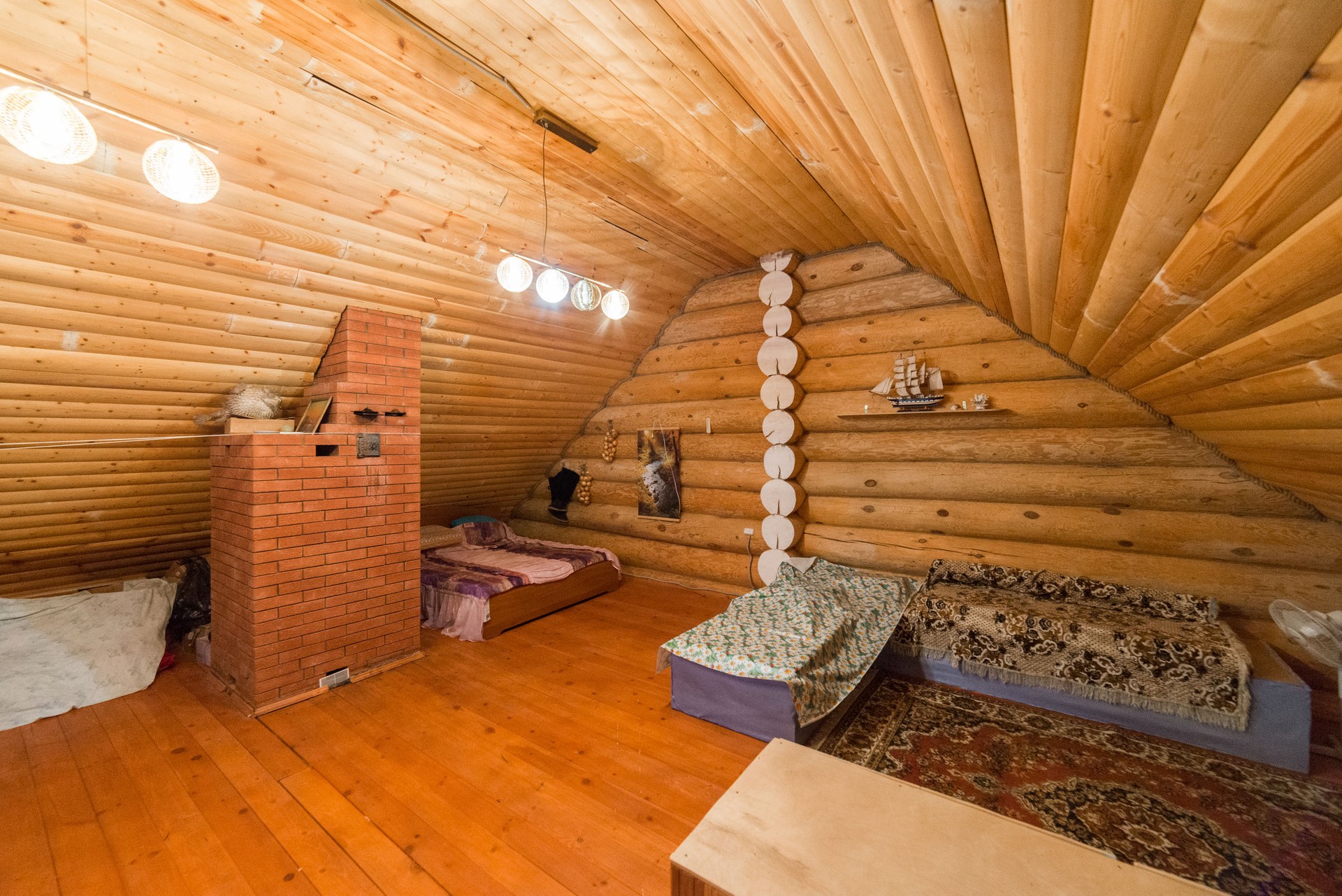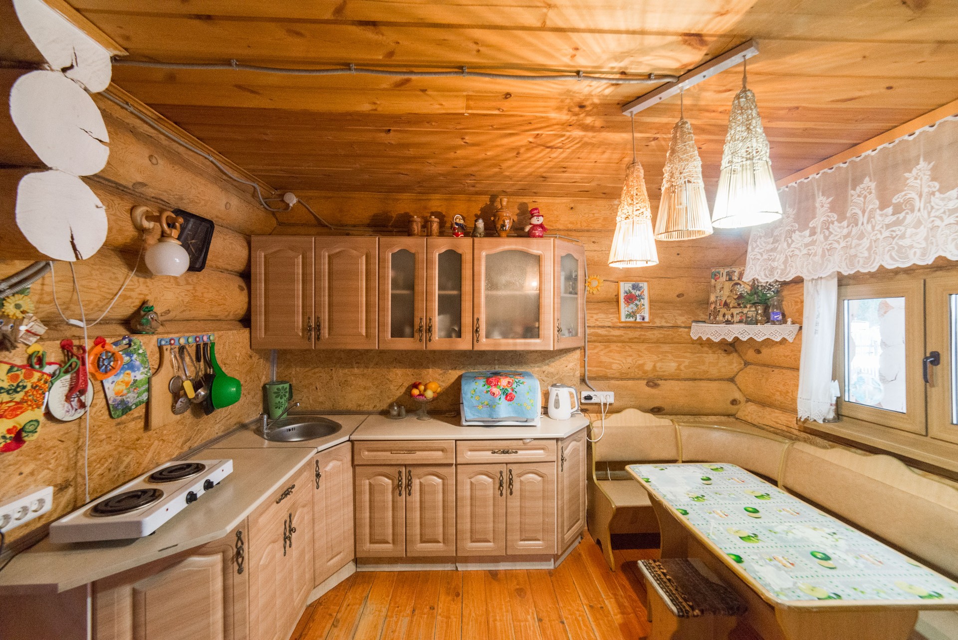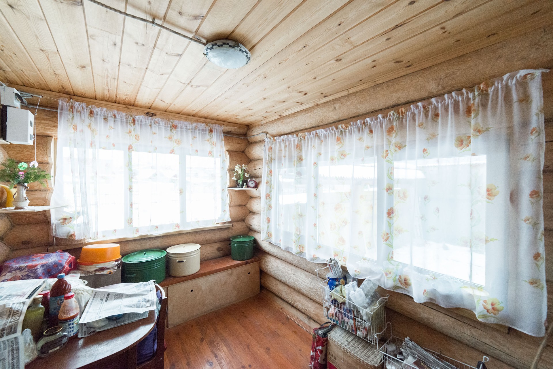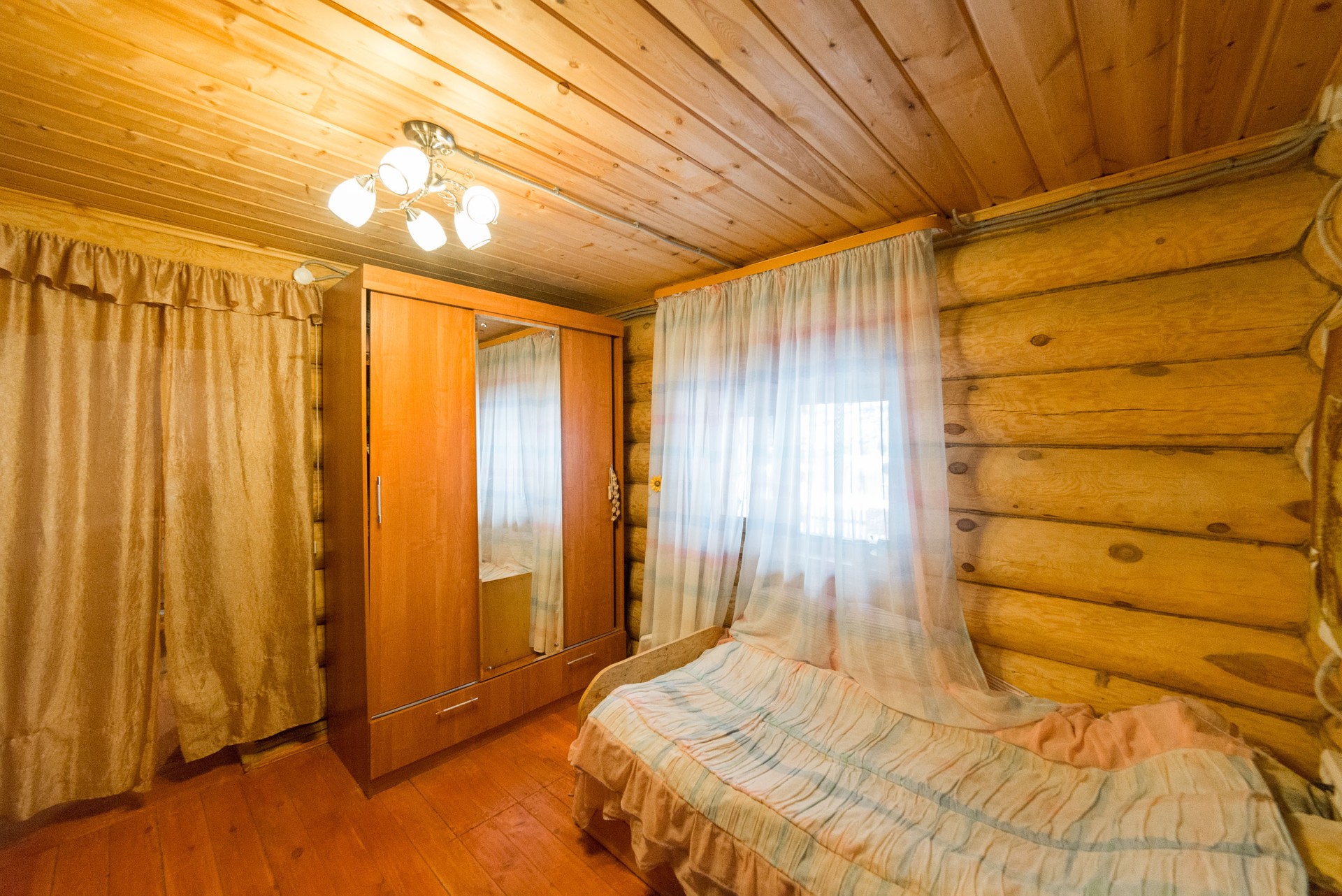 Первый этаж: холодная прихожая (сени), прихожая, теплый санузел, спальня, гостиная, кухня; второй этаж - свободное пространство, где организовано несколько спальных мест, гардеробная, балкон. Окна комнат (стеклопакеты) выходят на две стороны дома.