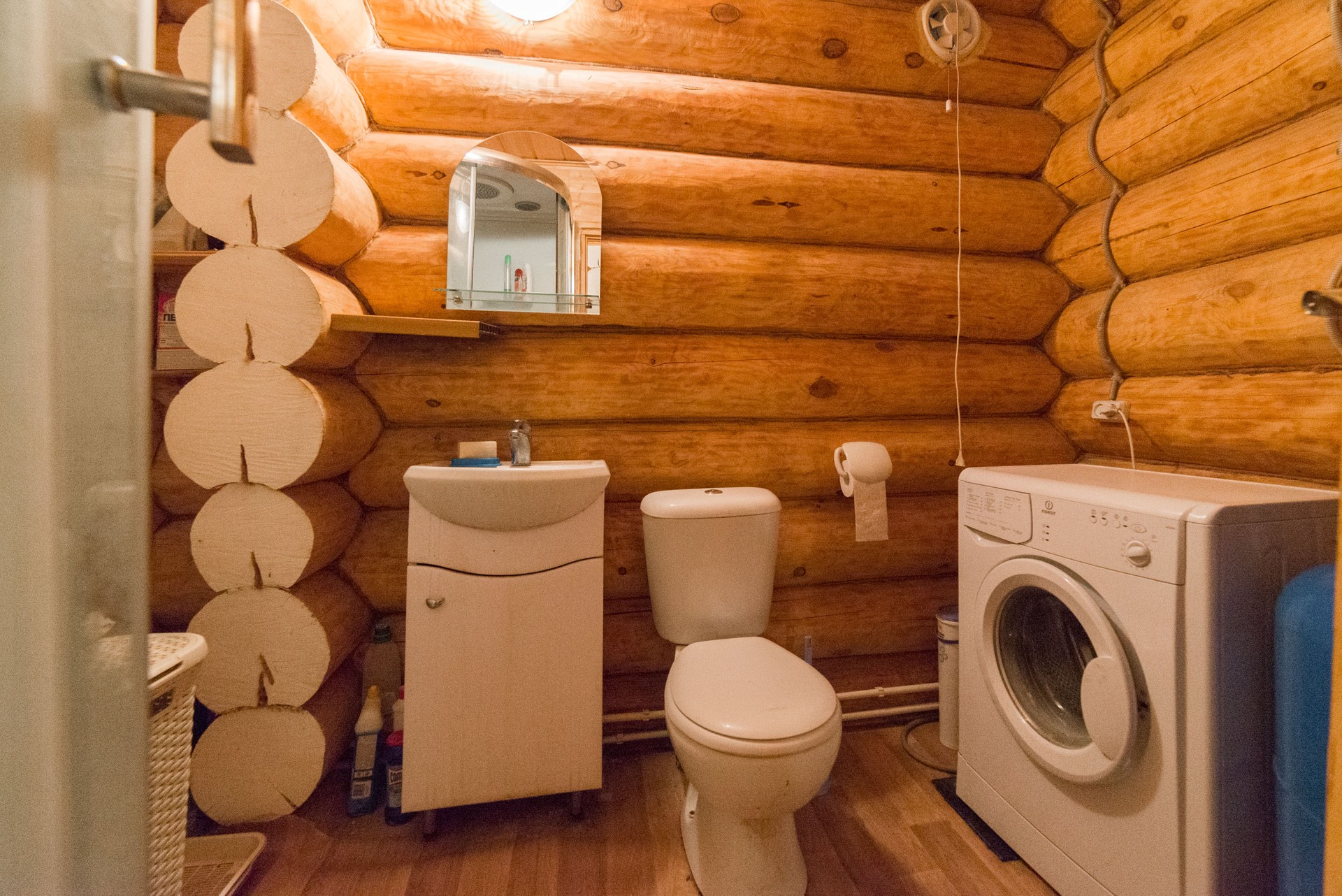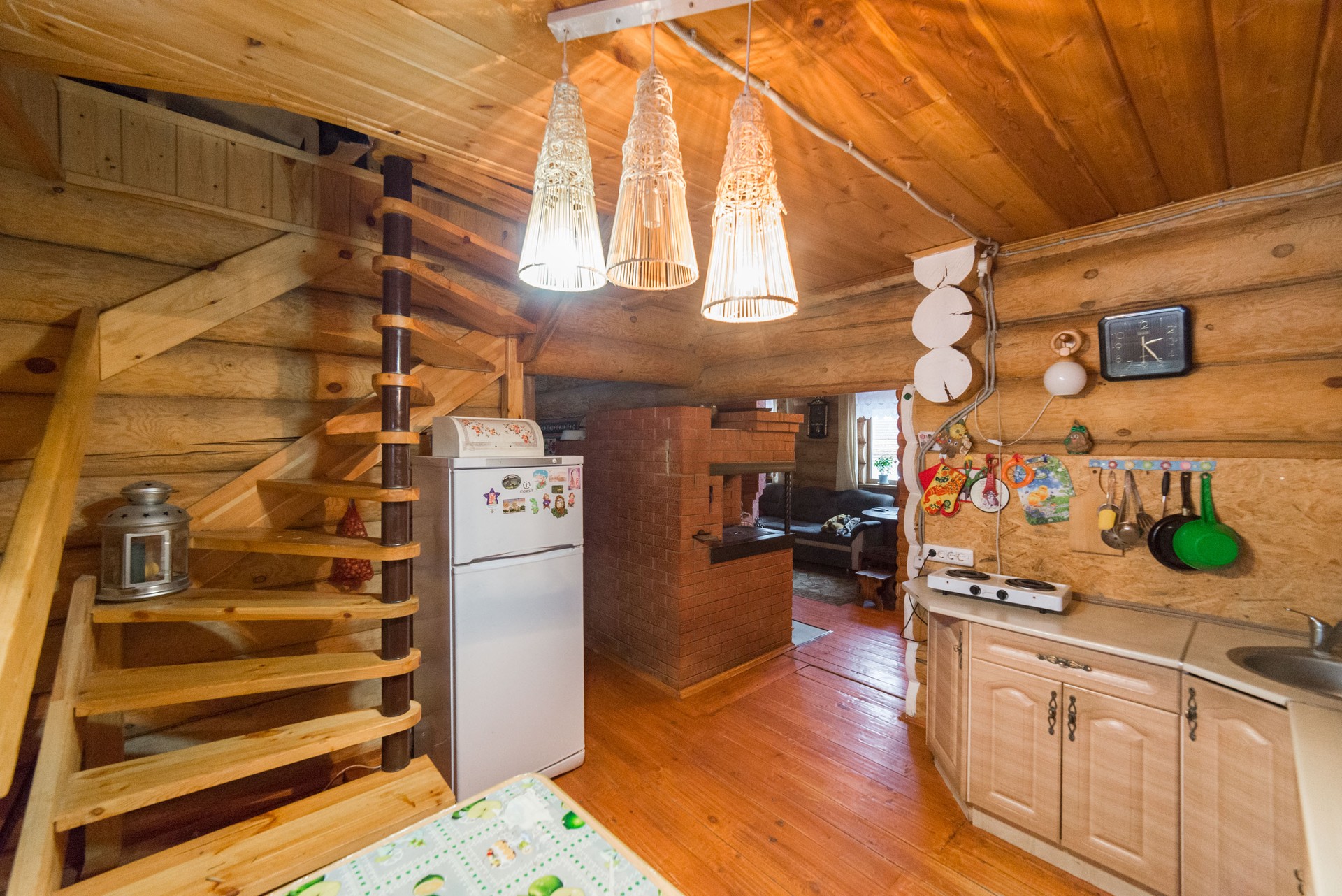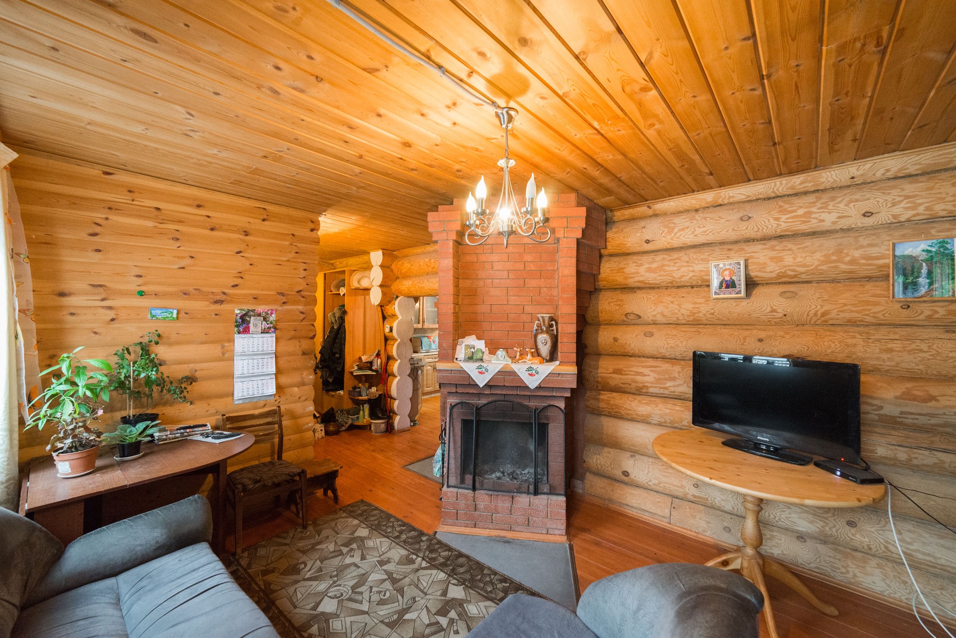 Дом построен из бревна, теплый, уютный, в нем прекрасно дышится. В самом доме: пол - деревянный, вода заведена в дом, на кухне поставлена раковина, поставлен счетчик на электроэнергию. Вода - из своей скважины, электроэнергия - сети. В доме установлен печь с камином, с помощью которой поддерживается тепло в доме. Есть баня, стайка, гараж и другие хозяйственные постройки.