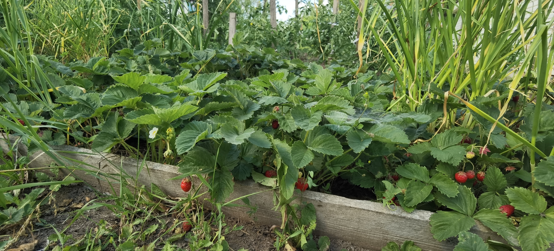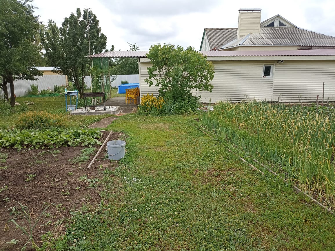 Огород обработан, плодоносящий сад с различными плодовыми культурами.