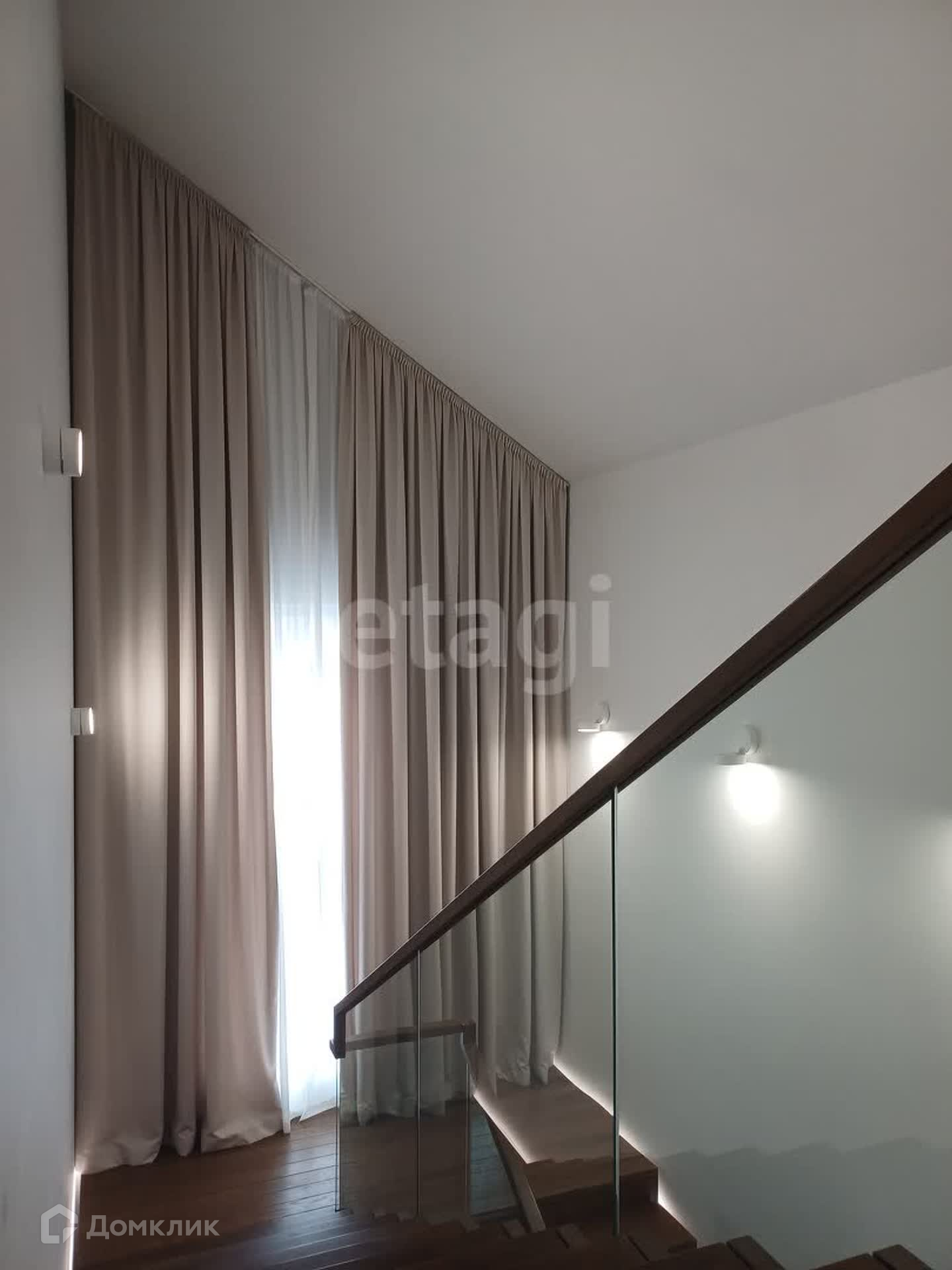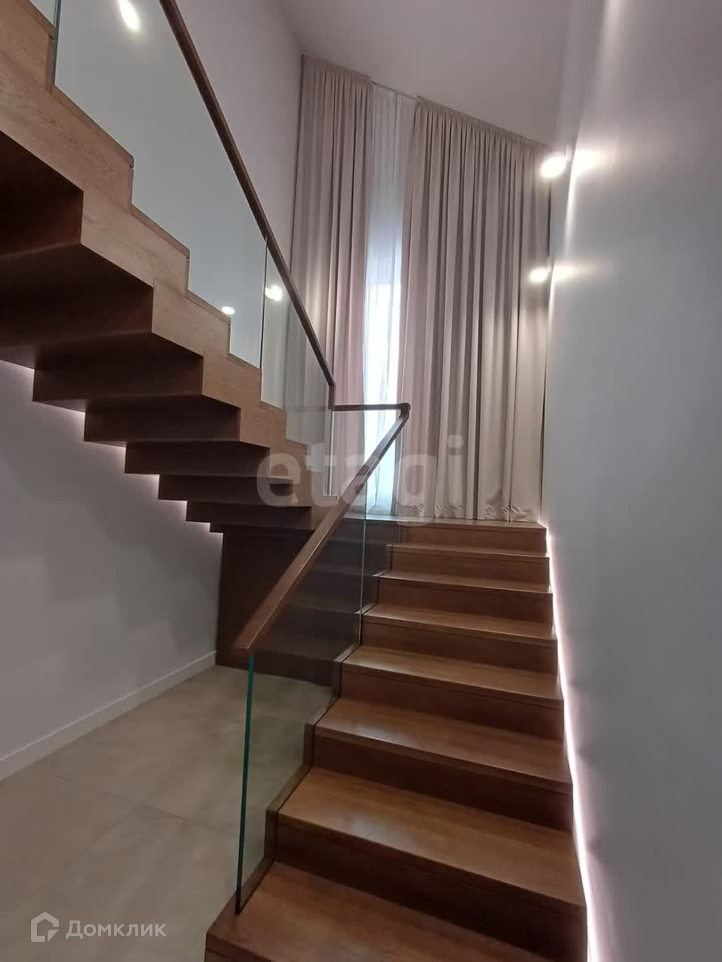 Пространство двух этажей объединяет современная лестница с подсветкой. Витражное окно.