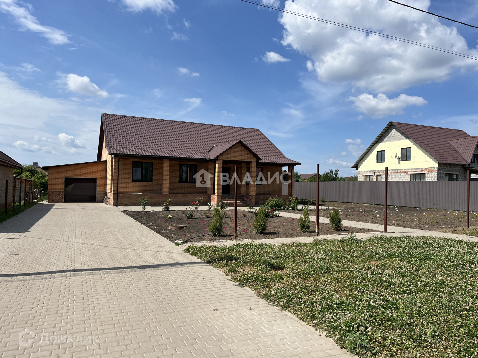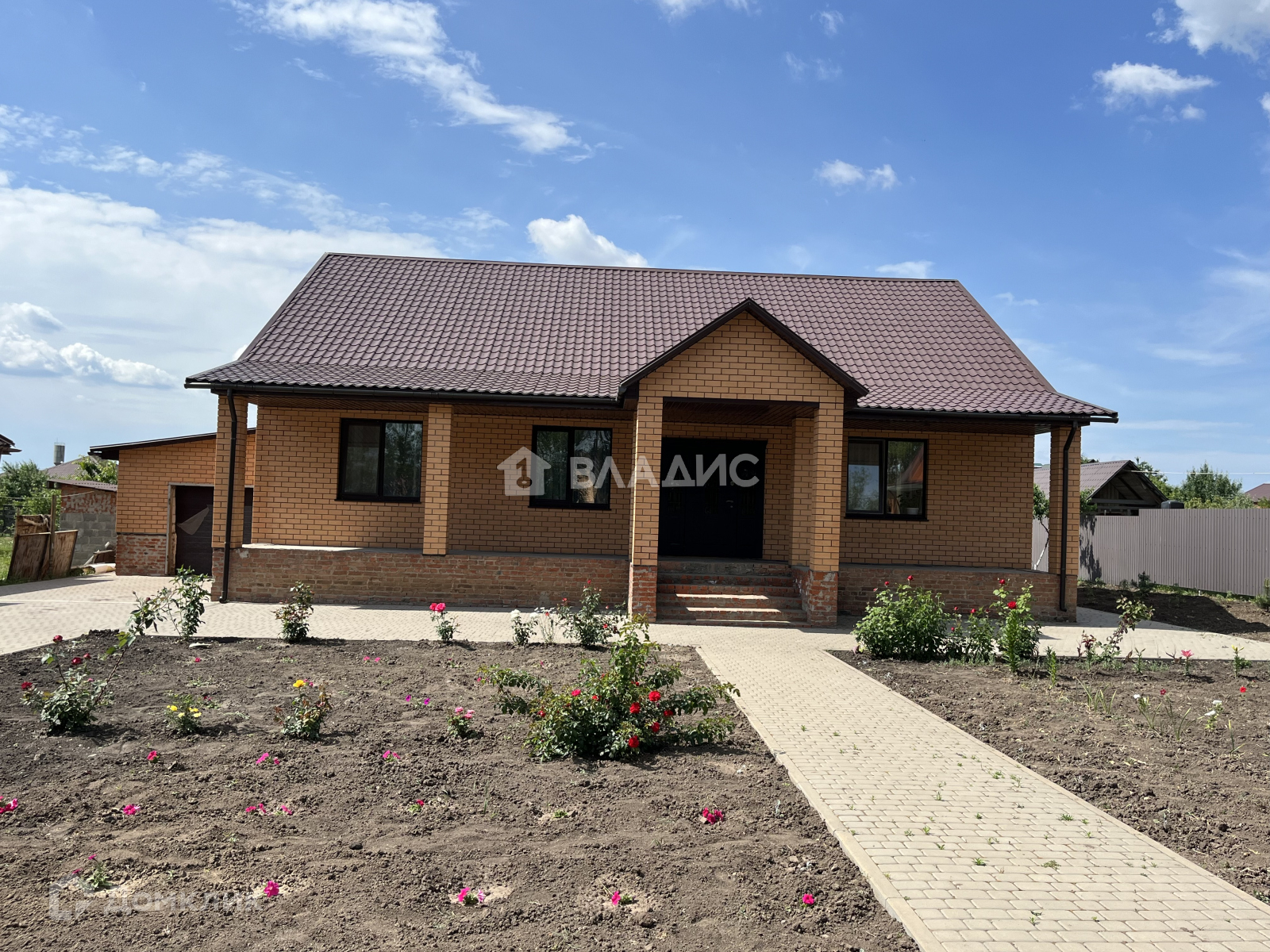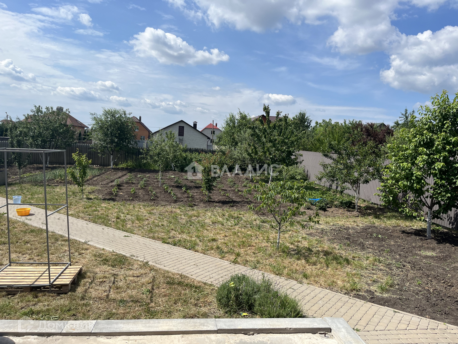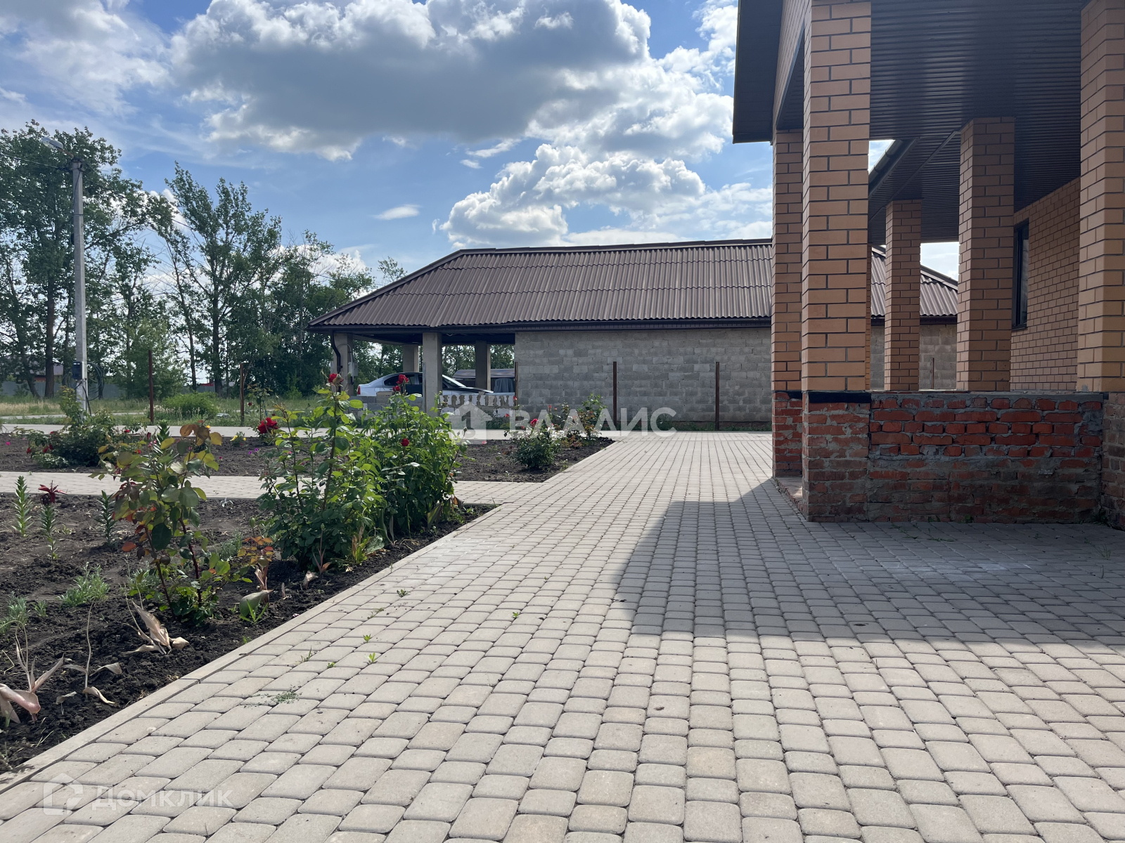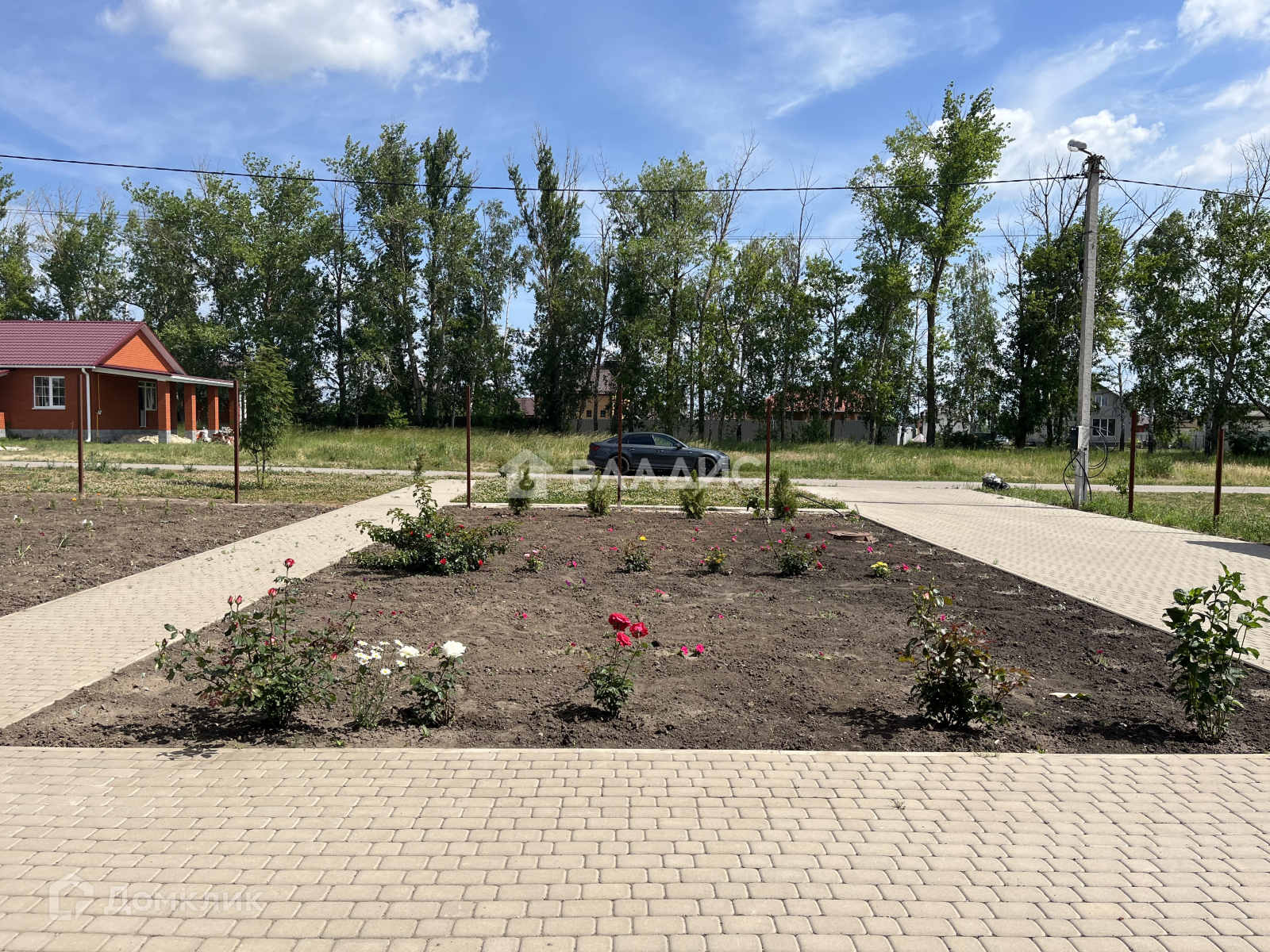 Территория в плитке, участок ухожен, молодой сад , цветы.