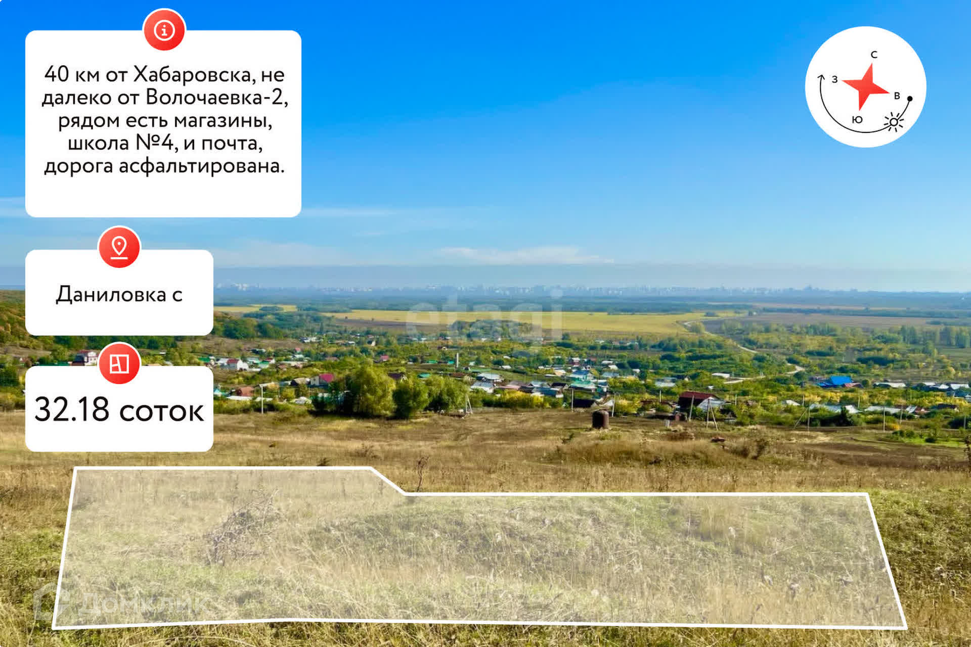 Продается участок с нежилым домом. Дом из дерева. В доме находиться скважина и проведено электричество в дом, из за того что дом не жилой он пустой есть только печка, отопление только печное. Поэтому продаем как участок, поэтому можно построить что то своё, свой домик или использовать его для посадки урожая, участок с межеванием, находиться село Даниловка, это за 40 км от Хабаровска, не далеко от Волочаевка-2, рядом есть магазины, школа №4, и почта, дорога асфальтирована.
