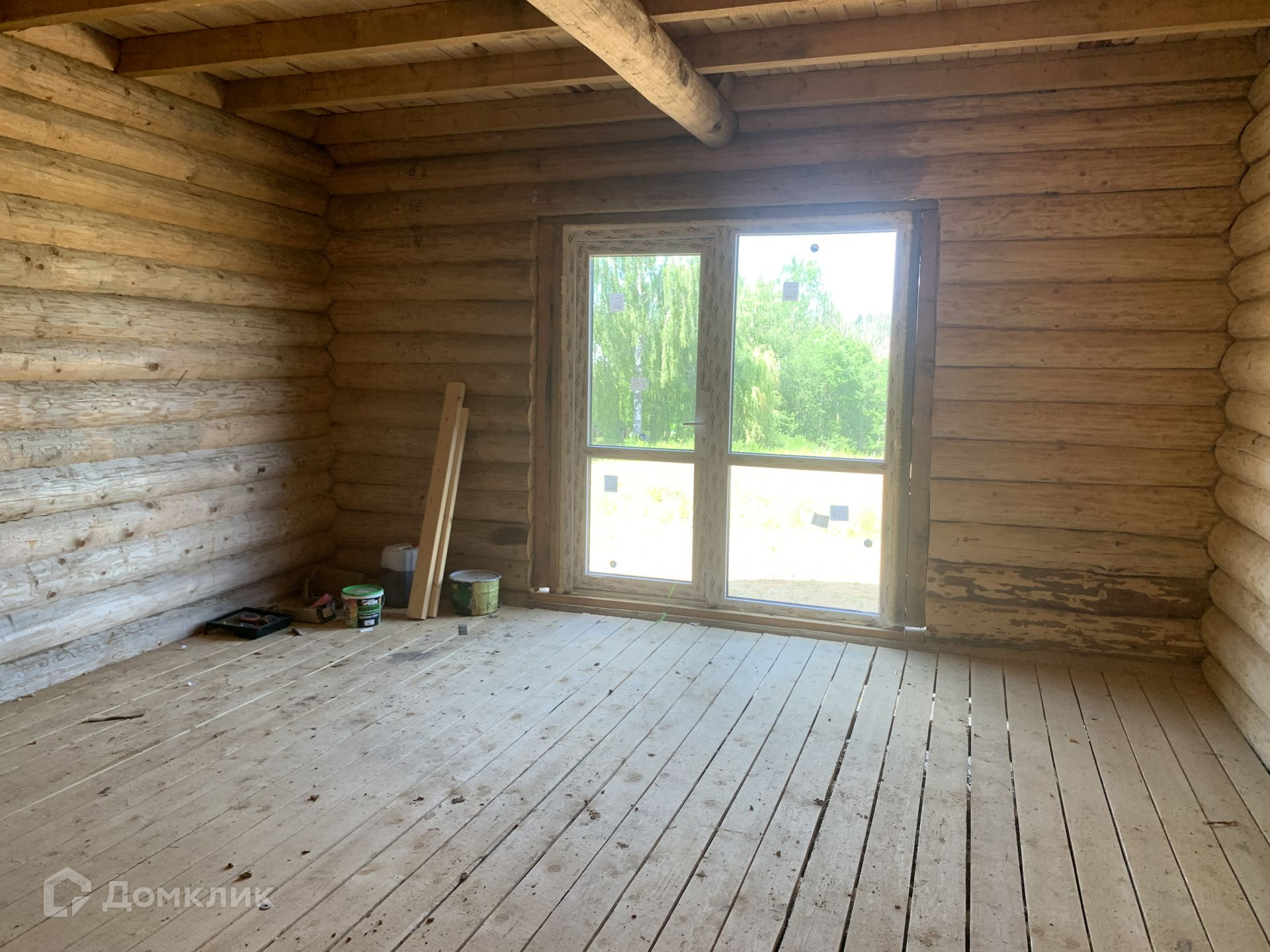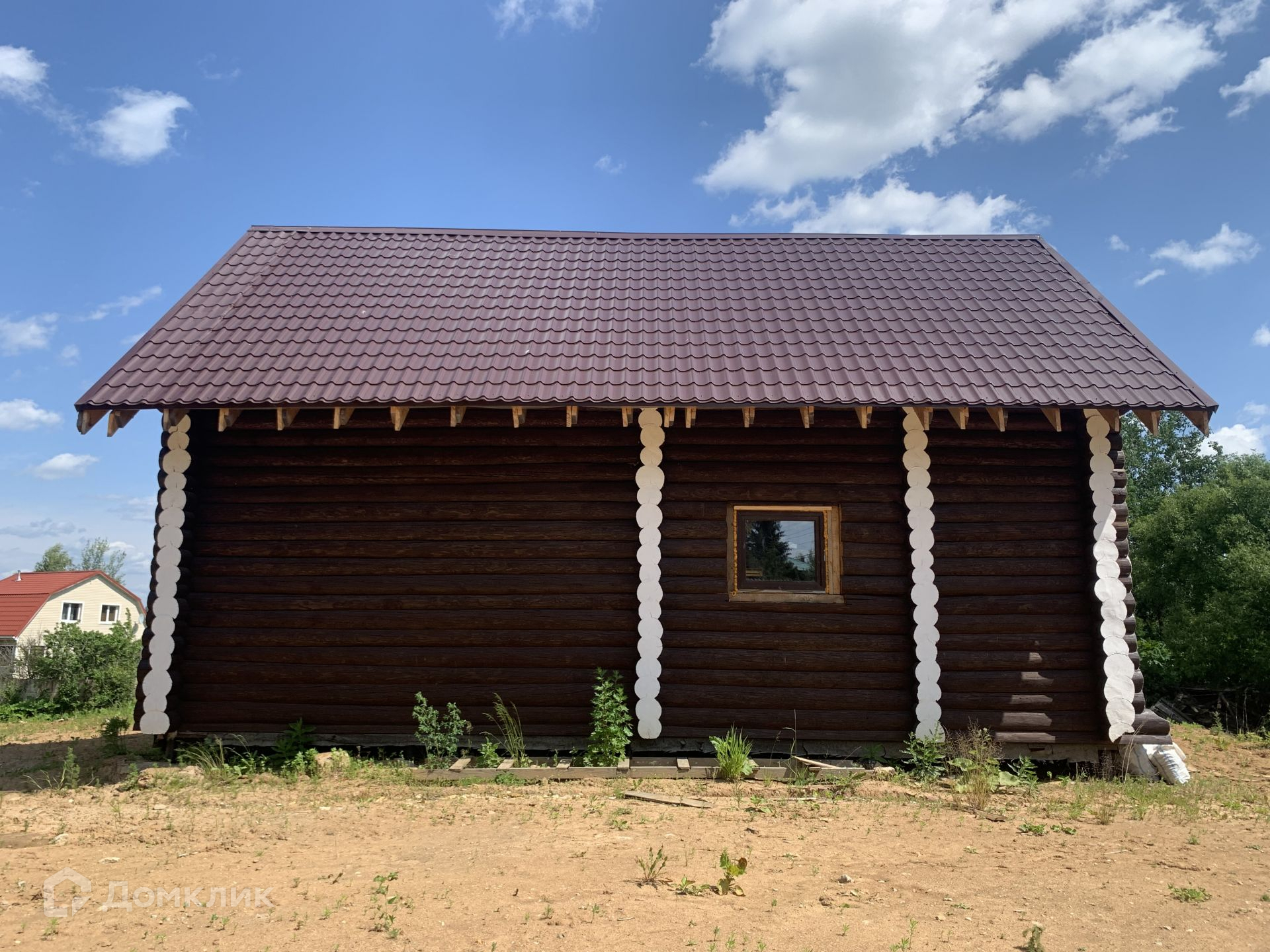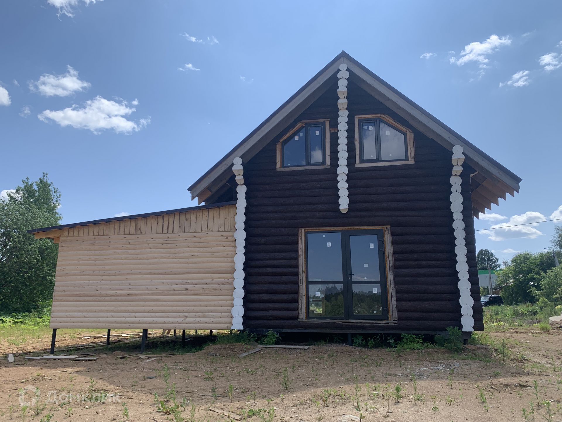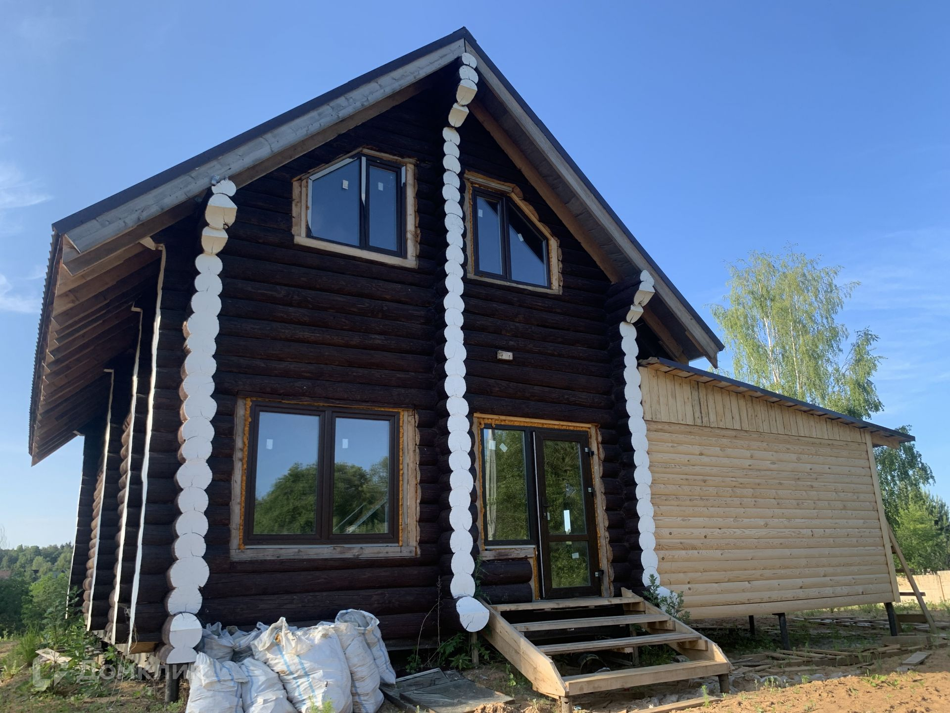 Дом выполнен из сруба, год он стоял для усадки, сруб снаружи пропитан коричневым лаком для дерева, торцы бревен в белый цвет выполнены.
